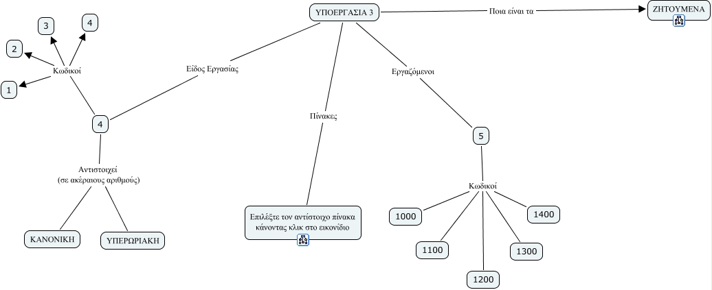 This Concept Map, created with IHMC CmapTools, has information related to: 3, 5 Κωδικοί 1000, 4 Κωδικοί 4, ΥΠΟΕΡΓΑΣΙΑ 3 Ποια είναι τα ΖΗΤΟΥΜΕΝΑ, 5 Κωδικοί 1200, 4 Αντιστοιχεί (σε ακέραιους αριθμούς) ΚΑΝΟΝΙΚΗ, ΥΠΟΕΡΓΑΣΙΑ 3 Πίνακες Επιλέξτε τον αντίστοιχο πίνακα κάνοντας κλικ στο εικονίδιο, 5 Κωδικοί 1100, ΥΠΟΕΡΓΑΣΙΑ 3 Είδος Εργασίας 4, 4 Κωδικοί 2, 4 Αντιστοιχεί (σε ακέραιους αριθμούς) ΥΠΕΡΩΡΙΑΚΗ, ΥΠΟΕΡΓΑΣΙΑ 3 Εργαζόμενοι 5, 4 Κωδικοί 3, 5 Κωδικοί 1400, 5 Κωδικοί 1300, 4 Κωδικοί 1