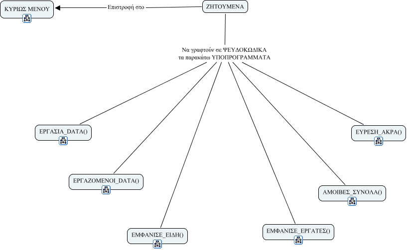 This Concept Map, created with IHMC CmapTools, has information related to: zhtoymena, ΖΗΤΟΥΜΕΝΑ Επιστροφή στο ΚΥΡΙΩΣ ΜΕΝΟΥ, ΖΗΤΟΥΜΕΝΑ Να γραφτούν σε ΨΕΥΔΟΚΩΔΙΚΑ τα παρακάτω ΥΠΟΠΡΟΓΡΑΜΜΑΤΑ ΕΡΓΑΣΙΑ_DATA(), ΖΗΤΟΥΜΕΝΑ Να γραφτούν σε ΨΕΥΔΟΚΩΔΙΚΑ τα παρακάτω ΥΠΟΠΡΟΓΡΑΜΜΑΤΑ ΕΜΦΑΝΙΣΕ_ΕΡΓΑΤΕΣ(), ΖΗΤΟΥΜΕΝΑ Να γραφτούν σε ΨΕΥΔΟΚΩΔΙΚΑ τα παρακάτω ΥΠΟΠΡΟΓΡΑΜΜΑΤΑ ΕΜΦΑΝΙΣΕ_ΕΙΔΗ(), ΖΗΤΟΥΜΕΝΑ Να γραφτούν σε ΨΕΥΔΟΚΩΔΙΚΑ τα παρακάτω ΥΠΟΠΡΟΓΡΑΜΜΑΤΑ ΑΜΟΙΒΕΣ_ΣΥΝΟΛΑ(), ΖΗΤΟΥΜΕΝΑ Να γραφτούν σε ΨΕΥΔΟΚΩΔΙΚΑ τα παρακάτω ΥΠΟΠΡΟΓΡΑΜΜΑΤΑ ΕΥΡΕΣΗ_ΑΚΡΑ(), ΖΗΤΟΥΜΕΝΑ Να γραφτούν σε ΨΕΥΔΟΚΩΔΙΚΑ τα παρακάτω ΥΠΟΠΡΟΓΡΑΜΜΑΤΑ ΕΡΓΑΖΟΜΕΝΟΙ_DATA()