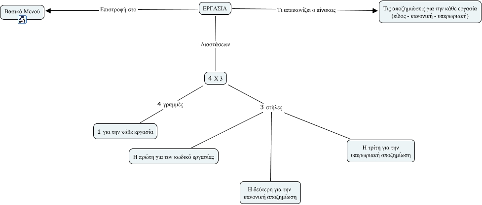This Concept Map, created with IHMC CmapTools, has information related to: table_ergasia, ΕΡΓΑΣΙΑ Επιστροφή στο Βασικό Μενού, 4 Χ 3 3 στήλες Η δεύτερη για την κανονική αποζημίωση, ΕΡΓΑΣΙΑ Διαστάσεων 4 Χ 3, ΕΡΓΑΣΙΑ Τι απεικονίζει ο πίνακας Τις αποζημιώσεις για την κάθε εργασία (είδος - κανονική - υπερωριακή), 4 Χ 3 3 στήλες Η τρίτη για την υπερωριακή αποζημίωση, 4 Χ 3 4 γραμμές 1 για την κάθε εργασία, 4 Χ 3 3 στήλες Η πρώτη για τον κωδικό εργασίας