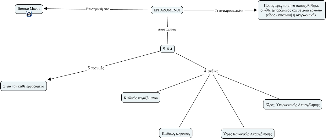This Concept Map, created with IHMC CmapTools, has information related to: table_ergazomenoi, 5 Χ 4 4 στήλες Ώρες Κανονικής Απασχόλησης, 5 Χ 4 5 γραμμές 1 για τον κάθε εργαζόμενο, 5 Χ 4 4 στήλες Κωδικός εργασίας, ΕΡΓΑΖΟΜΕΝΟΙ Τι αντιπροσωπεύει Πόσες ώρες το μήνα απασχολήθηκε ο κάθε εργαζόμενος και σε ποια εργασία (είδος - κανονική ή υπερωριακή), ΕΡΓΑΖΟΜΕΝΟΙ Διαστάσεων 5 Χ 4, ΕΡΓΑΖΟΜΕΝΟΙ Επιστροφή στο Βασικό Μενού, 5 Χ 4 4 στήλες Κωδικός εργαζόμενου, 5 Χ 4 4 στήλες Ώρες Υπερωριακής Απασχόλησης