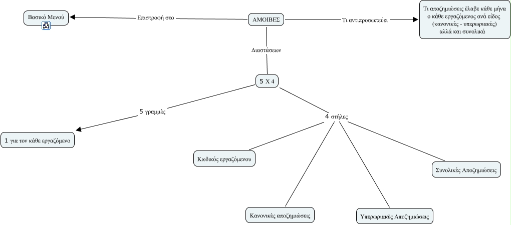 This Concept Map, created with IHMC CmapTools, has information related to: table_amoibes, 5 Χ 4 4 στήλες Υπερωριακές Αποζημιώσεις, 5 Χ 4 4 στήλες Κανονικές αποζημιώσεις, 5 Χ 4 5 γραμμές 1 για τον κάθε εργαζόμενο, ΑΜΟΙΒΕΣ Τι αντιπροσωπεύει Τι αποζημιώσεις έλαβε κάθε μήνα ο κάθε εργαζόμενος ανά είδος (κανονικές - υπερωριακές) αλλά και συνολικά, ΑΜΟΙΒΕΣ Διαστάσεων 5 Χ 4, ΑΜΟΙΒΕΣ Επιστροφή στο Βασικό Μενού, 5 Χ 4 4 στήλες Κωδικός εργαζόμενου, 5 Χ 4 4 στήλες Συνολικές Αποζημιώσεις