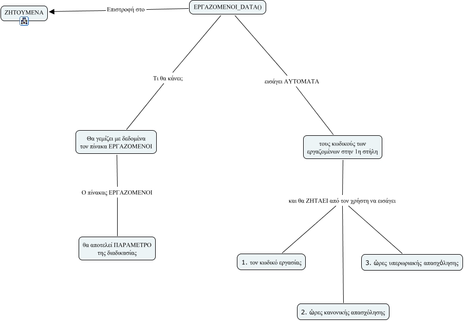 This Concept Map, created with IHMC CmapTools, has information related to: ergazomenoi_data, τους κωδικούς των εργαζομένων στην 1η στήλη και θα ΖΗΤΑΕΙ από τον χρήστη να εισάγει 1. τον κωδικό εργασίας, ΕΡΓΑZOMENOI_DATA() Τι θα κάνει; Θα γεμίζει με δεδομένα τον πίνακα ΕΡΓΑZOMENOI, ΕΡΓΑZOMENOI_DATA() Επιστροφή στο ΖΗΤΟΥΜΕΝΑ, τους κωδικούς των εργαζομένων στην 1η στήλη και θα ΖΗΤΑΕΙ από τον χρήστη να εισάγει 2. ώρες κανονικής απασχόλησης, ΕΡΓΑZOMENOI_DATA() εισάγει ΑΥΤΟΜΑΤΑ τους κωδικούς των εργαζομένων στην 1η στήλη, Θα γεμίζει με δεδομένα τον πίνακα ΕΡΓΑZOMENOI Ο πίνακας ΕΡΓΑZOMENOI θα αποτελεί ΠΑΡΑΜΕΤΡΟ της διαδικασίας, τους κωδικούς των εργαζομένων στην 1η στήλη και θα ΖΗΤΑΕΙ από τον χρήστη να εισάγει 3. ώρες υπερωριακής απασχόλησης
