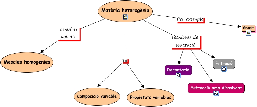 Este Cmap, tiene información relacionada con: Mapa Matèria heterogènia, Matèria heterogènia Té Propietats variables, Matèria heterogènia Té Composició variable, Matèria heterogènia Tècniques de separació Extracció amb dissolvent, Matèria heterogènia Per exemple Granit, Matèria heterogènia També es pot dir Mescles homogènies, Matèria heterogènia Tècniques de separació Filtració, Matèria heterogènia Tècniques de separació Decantació