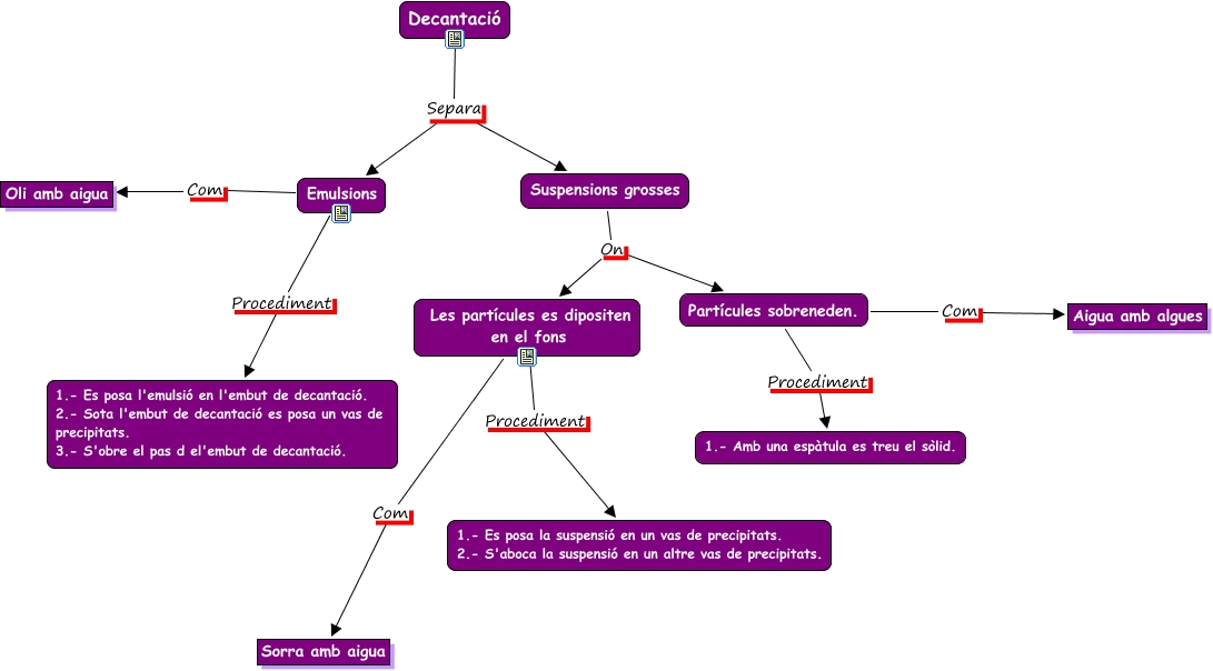 Este Cmap, tiene información relacionada con: Mapa Decantació, Emulsions Procediment 1.- Es posa l'emulsió en l'embut de decantació. 2.- Sota l'embut de decantació es posa un vas de precipitats. 3.- S'obre el pas d el'embut de decantació., Decantació Separa Suspensions grosses, Partícules sobreneden. Procediment 1.- Amb una espàtula es treu el sòlid., Decantació Separa Emulsions, Partícules sobreneden. Com Aigua amb algues, Suspensions grosses On Les partícules es dipositen en el fons, Suspensions grosses On Partícules sobreneden., Les partícules es dipositen en el fons Procediment 1.- Es posa la suspensió en un vas de precipitats. 2.- S'aboca la suspensió en un altre vas de precipitats., Emulsions Com Oli amb aigua, Les partícules es dipositen en el fons Com Sorra amb aigua
