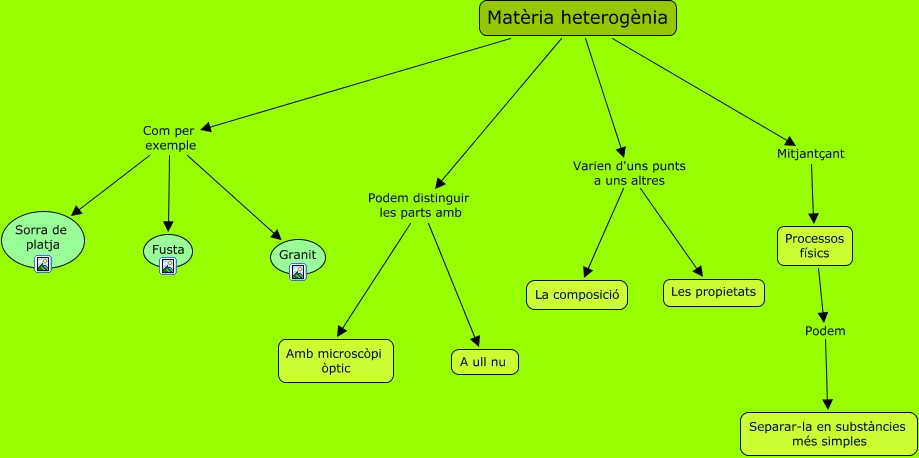 Este Cmap, tiene información relacionada con: materia heterogènia, Matèria heterogènia Varien d'uns punts a uns altres Les propietats, Matèria heterogènia Varien d'uns punts a uns altres La composició, Matèria heterogènia Podem distinguir les parts amb A ull nu, Matèria heterogènia Com per exemple Sorra de platja, Matèria heterogènia Mitjantçant Processos físics, Matèria heterogènia Com per exemple Granit, Matèria heterogènia Podem distinguir les parts amb Amb microscòpi òptic, Processos físics Podem Separar-la en substàncies més simples, Matèria heterogènia Com per exemple Fusta
