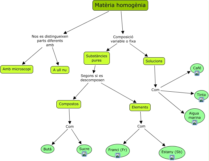 Este Cmap, tiene información relacionada con: matèria homogènia, Elements Com Franci (Fr), Substàncies pures Segons si es descomposen Elements, Matèria homogènia Composició variable o fixa Substàncies pures, Matèria homogènia Nos es distingueixen parts diferents amb Amb microscopi, Solucions Com Café, Matèria homogènia Composició variable o fixa Solucions, Solucions Com Tinta, Matèria homogènia Nos es distingueixen parts diferents amb A ull nu, Elements Com Estany (Sb), Compostos Com Sucre, Compostos Com Butà, Substàncies pures Segons si es descomposen Compostos, Solucions Com Aigua marina