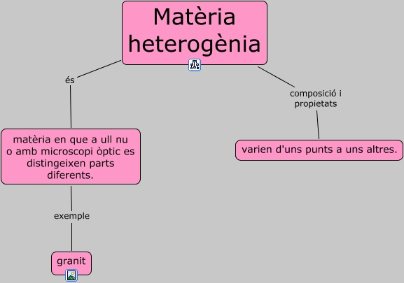 Este Cmap, tiene información relacionada con: Matèria heterogènia, Matèria heterogènia composició i propietats varien d'uns punts a uns altres., Matèria heterogènia és matèria en que a ull nu o amb microscopi òptic es distingeixen parts diferents., matèria en que a ull nu o amb microscopi òptic es distingeixen parts diferents. exemple granit