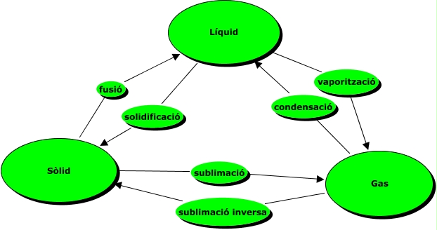 Este mapa conceptual tiene información relacionada a: Canvis d'estat, Gas condensació Líquid, Sòlid sublimació Gas, Gas sublimació inversa Sòlid, Líquid solidificació Sòlid, Líquid vaporització Gas, Sòlid fusió Líquid