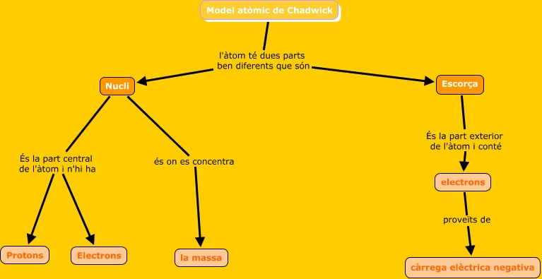 Este Cmap, tiene información relacionada con: Model atòmic de Chadwick, Escorça És la part exterior de l'àtom i conté electrons, Model atòmic de Chadwick l'àtom té dues parts ben diferents que són Nucli, Model atòmic de Chadwick l'àtom té dues parts ben diferents que són Escorça, Nucli És la part central de l'àtom i n'hi ha Protons, electrons proveïts de càrrega elèctrica negativa, Nucli És la part central de l'àtom i n'hi ha Electrons, Nucli és on es concentra la massa