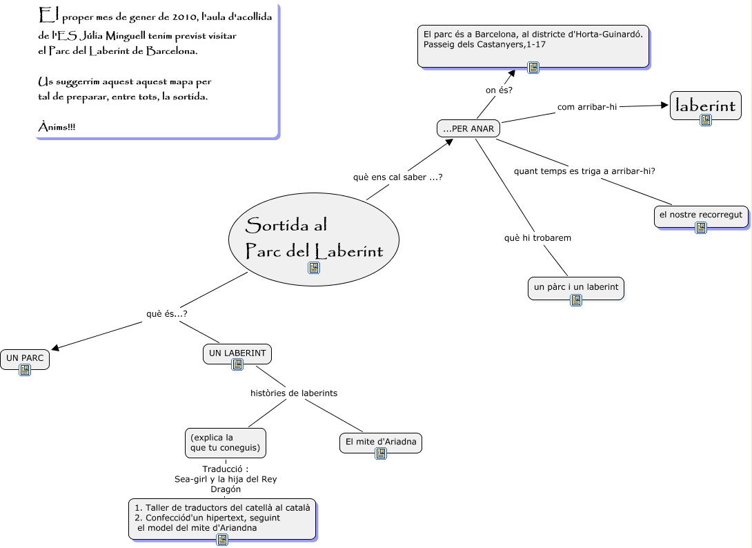 Aquest mapa conceptual conté informació relacionada amb: Sortida al parc del laberint i el mite d'Ariadana, (explica la que tu coneguis) Traducció : Sea-girl y la hija del Rey Dragón 1. Taller de traductors del catellà al català 2. Confecciód'un hipertext, seguint el model del mite d'Ariandna, ...PER ANAR com arribar-hi laberint, UN LABERINT històries de laberints El mite d'Ariadna, ...PER ANAR quant temps es triga a arribar-hi? el nostre recorregut, Sortida al Parc del Laberint què és...? UN PARC, ...PER ANAR què hi trobarem un pàrc i un laberint, Sortida al Parc del Laberint què és...? UN LABERINT, Sortida al Parc del Laberint què ens cal saber ...? ...PER ANAR, UN LABERINT històries de laberints (explica la que tu coneguis), ...PER ANAR on és? El parc és a Barcelona, al districte d'Horta-Guinardó. Passeig dels Castanyers,1-17