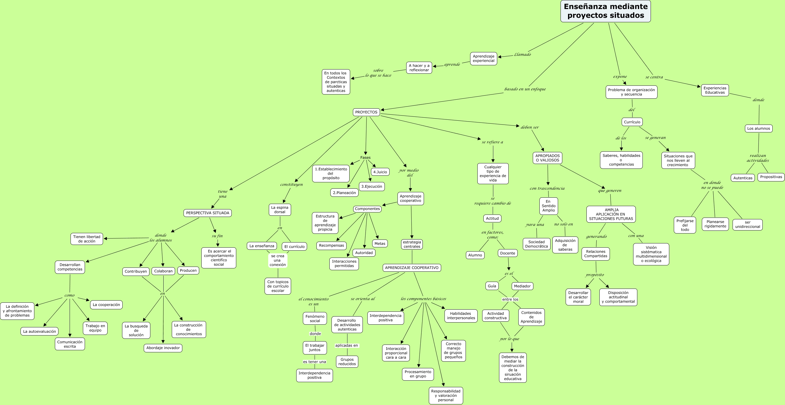 Enseñanza mediante proyectos, PROYECTOS constituyen La espina dorsal, Colaboran en Abordaje inovador, Desarrollan competencias como Trabajo en equipo, Docente es el Guía, PROYECTOS por medio del Aprendizaje cooperativo, APRENDIZAJE COOPERATIVO los componentes básicos Procesamiento en grupo, Aprendizaje cooperativo Componentes Estructura de aprendizaje propicia, Desarrollan competencias como Comunicación escrita, Aprendizaje experiencial aprende A hacer y a reflexionar, A hacer y a reflexionar sobre lo que se hace En todos los Contextos de parcticas situadas y autenticas
