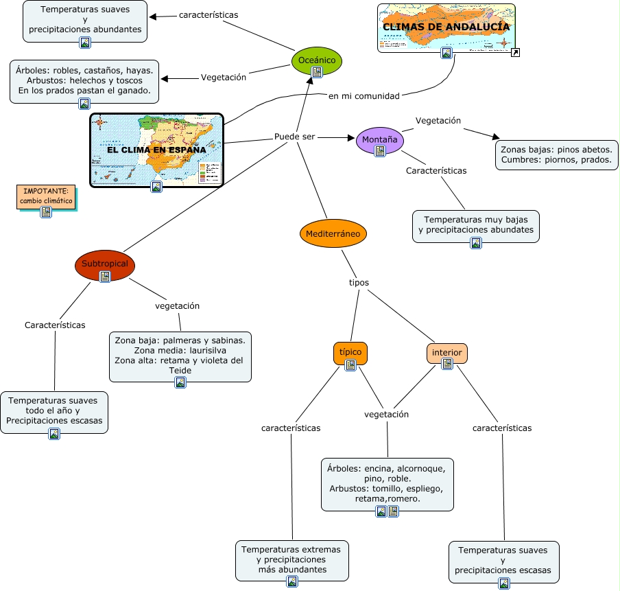 Este Cmap, tiene información relacionada con: Clima de España, típico vegetación Árboles: encina, alcornoque, pino, roble. Arbustos: tomillo, espliego, retama,romero., EL CLIMA EN ESPAÑA Puede ser Montaña, Mediterráneo tipos típico, interior características Temperaturas suaves y precipitaciones escasas, Subtropical Características Temperaturas suaves todo el año y Precipitaciones escasas, Oceánico Vegetación Árboles: robles, castaños, hayas. Arbustos: helechos y toscos En los prados pastan el ganado., EL CLIMA EN ESPAÑA Puede ser Mediterráneo, interior vegetación Árboles: encina, alcornoque, pino, roble. Arbustos: tomillo, espliego, retama,romero., Subtropical vegetación Zona baja: palmeras y sabinas. Zona media: laurisilva Zona alta: retama y violeta del Teide, EL CLIMA EN ESPAÑA Puede ser Subtropical, típico características Temperaturas extremas y precipitaciones más abundantes, Montaña Características Temperaturas muy bajas y precipitaciones abundates, EL CLIMA EN ESPAÑA Puede ser Oceánico, Montaña Vegetación Zonas bajas: pinos abetos. Cumbres: piornos, prados., Oceánico características Temperaturas suaves y precipitaciones abundantes, CLIMAS DE ANDALUCÍA en mi comunidad EL CLIMA EN ESPAÑA, Mediterráneo tipos interior