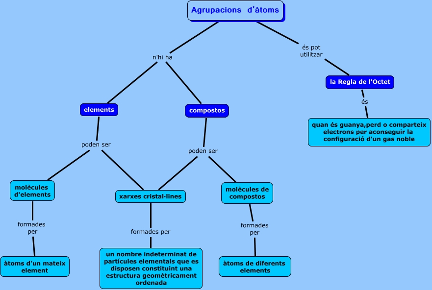 Este Cmap, tiene información relacionada con: Agrupacions d'àtoms, elements poden ser xarxes cristal·lines, compostos poden ser molècules de compostos, molècules de compostos formades per àtoms de diferents elements, elements poden ser molècules d'elements, compostos poden ser xarxes cristal·lines, molècules d'elements formades per àtoms d'un mateix element, xarxes cristal·lines formades per un nombre indeterminat de partícules elementals que es disposen constituint una estructura geomètricament ordenada, la Regla de l'Octet és quan és guanya,perd o comparteix electrons per aconseguir la configuració d'un gas noble, Agrupacions d'àtoms n'hi ha compostos, Agrupacions d'àtoms n'hi ha elements, Agrupacions d'àtoms és pot utilitzar la Regla de l'Octet