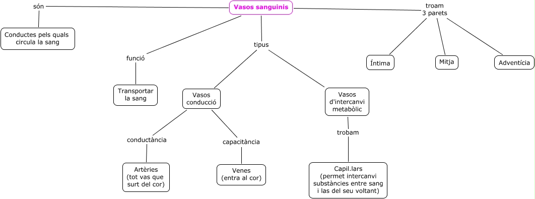 Este Cmap, tiene información relacionada con: Vasos sanguinis, Vasos sanguinis funció Transportar la sang, Vasos conducció conductància Artèries (tot vas que surt del cor), Vasos sanguinis són Conductes pels quals circula la sang, Vasos conducció capacitància Venes (entra al cor), Vasos sanguinis tipus Vasos d'intercanvi metabòlic, Vasos sanguinis troam 3 parets Íntima, Vasos sanguinis troam 3 parets Adventícia, Vasos sanguinis troam 3 parets Mitja, Vasos d'intercanvi metabòlic trobam Capil.lars (permet intercanvi substàncies entre sang i las del seu voltant), Vasos sanguinis tipus Vasos conducció