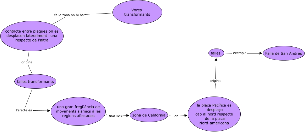 Este Cmap, tiene información relacionada con: Transformants, Vores transformants és la zona on hi ha contacte entre plaques on es desplacen lateralment l'una respecte de l'altra, una gran fregüència de moviments sísmics a les regions afectades exemple zona de Califòrnia, contacte entre plaques on es desplacen lateralment l'una respecte de l'altra origina falles transformants, la placa Pacífica es desplaça cap al nord respecte de la placa Nord-americana origina falles, falles exemple Falla de San Andreu, falles transformants l'efecte és una gran fregüència de moviments sísmics a les regions afectades, zona de Califòrnia on la placa Pacífica es desplaça cap al nord respecte de la placa Nord-americana