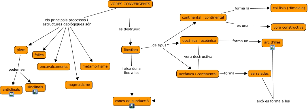 vores convergents, VORES CONVERGENTS es destrueix litosfera, VORES CONVERGENTS els principals processos i estructures geològiques són encavalcaments, VORES CONVERGENTS els principals processos i estructures geològiques són magmatisme, litosfera de tipus continental i continental, litosfera de tipus oceànica i oceànica, litosfera de tipus oceànica i continental, oceànica i oceànica forma un arc d'illes, litosfera i això dona lloc a les zones de subducció, continental i continental és una vora constructiva, VORES CONVERGENTS els principals processos i estructures geològiques són metamorfisme