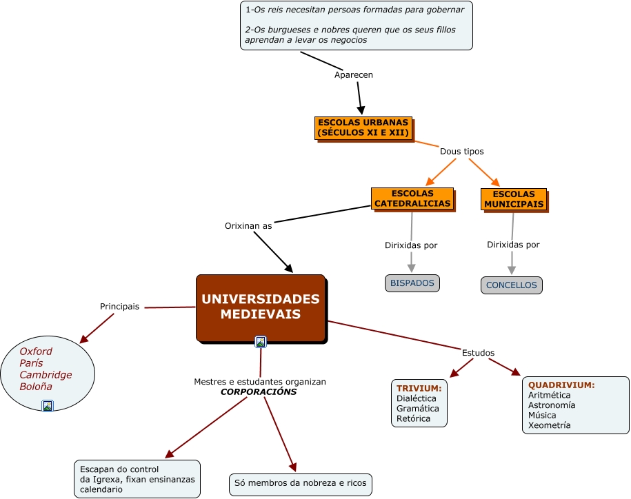 Este Cmap, tiene información relacionada con: UNIVERSIDADES MEDIEVAIS, ESCOLAS CATEDRALICIAS Orixinan as UNIVERSIDADES MEDIEVAIS, ESCOLAS URBANAS (SÉCULOS XI E XII) Dous tipos ESCOLAS MUNICIPAIS, UNIVERSIDADES MEDIEVAIS Principais Oxford París Cambridge Boloña, ESCOLAS MUNICIPAIS Dirixidas por CONCELLOS, UNIVERSIDADES MEDIEVAIS Estudos TRIVIUM: Dialéctica Gramática Retórica, ESCOLAS CATEDRALICIAS Dirixidas por BISPADOS, UNIVERSIDADES MEDIEVAIS Estudos QUADRIVIUM: Aritmética Astronomía Música Xeometría, UNIVERSIDADES MEDIEVAIS Mestres e estudantes organizan CORPORACIÓNS Só membros da nobreza e ricos, 1-Os reis necesitan persoas formadas para gobernar 2-Os burgueses e nobres queren que os seus fillos aprendan a levar os negocios Aparecen ESCOLAS URBANAS (SÉCULOS XI E XII), UNIVERSIDADES MEDIEVAIS Mestres e estudantes organizan CORPORACIÓNS Escapan do control da Igrexa, fixan ensinanzas calendario, ESCOLAS URBANAS (SÉCULOS XI E XII) Dous tipos ESCOLAS CATEDRALICIAS