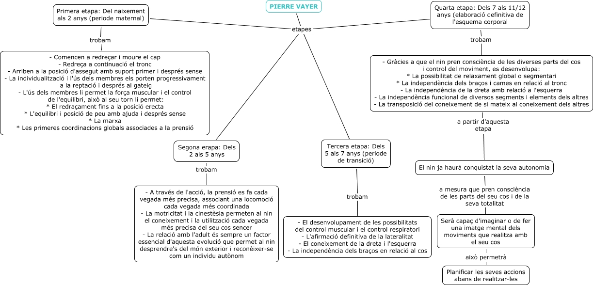 Este Cmap, tiene información relacionada con: Pierre Vayer, PIERRE VAYER etapes Primera etapa: Del naixement als 2 anys (periode maternal), Quarta etapa: Dels 7 als 11/12 anys (elaboració definitiva de l'esquema corporal trobam - Gràcies a que el nin pren consciència de les diverses parts del cos i control del moviment, es desenvolupa: * La possibilitat de relaxament global o segmentari * La independència dels braços i cames en relació al tronc - La independència de la dreta amb relació a l'esquerra - La independència funcional de diversos segments i elements dels altres - La transposició del coneixement de si mateix al coneixement dels altres, - Gràcies a que el nin pren consciència de les diverses parts del cos i control del moviment, es desenvolupa: * La possibilitat de relaxament global o segmentari * La independència dels braços i cames en relació al tronc - La independència de la dreta amb relació a l'esquerra - La independència funcional de diversos segments i elements dels altres - La transposició del coneixement de si mateix al coneixement dels altres a partir d'aquesta etapa El nin ja haurà conquistat la seva autonomia, PIERRE VAYER etapes Tercera etapa: Dels 5 als 7 anys (periode de transició), Primera etapa: Del naixement als 2 anys (periode maternal) trobam - Comencen a redreçar i moure el cap - Redreça a continuació el tronc - Arriben a la posició d'assegut amb suport primer i després sense - La individualització i l'ús dels membres els porten progressivament a la reptació i després al gateig - L'ús dels membres li permet la força muscular i el control de l'equilibri, això al seu torn li permet: * El redraçament fins a la posició erecta * L'equilibri i posició de peu amb ajuda i després sense * La marxa * Les primeres coordinacions globals associades a la prensió, Serà capaç d'imaginar o de fer una imatge mental dels moviments que realitza amb el seu cos això permetrà Planificar les seves accions abans de realitzar-les, El nin ja haurà conquistat la seva autonomia a mesura que pren consciència de les parts del seu cos i de la seva totalitat Serà capaç d'imaginar o de fer una imatge mental dels moviments que realitza amb el seu cos, Segona erapa: Dels 2 als 5 anys trobam - A través de l'acció, la prensió es fa cada vegada més precisa, associant una locomoció cada vegada més coordinada - La motricitat i la cinestèsia permeten al nin el coneixement i la utilització cada vegada més precisa del seu cos sencer - La relació amb l'adult és sempre un factor essencial d'aquesta evolució que permet al nin desprendre's del món exterior i reconèixer-se com un individu autònom, PIERRE VAYER etapes Quarta etapa: Dels 7 als 11/12 anys (elaboració definitiva de l'esquema corporal, Tercera etapa: Dels 5 als 7 anys (periode de transició) trobam - El desenvolupament de les possibilitats del control muscular i el control respiratori - L'afirmació definitiva de la lateralitat - El coneixement de la dreta i l'esquerra - La independència dels braços en relació al cos, PIERRE VAYER etapes Segona erapa: Dels 2 als 5 anys
