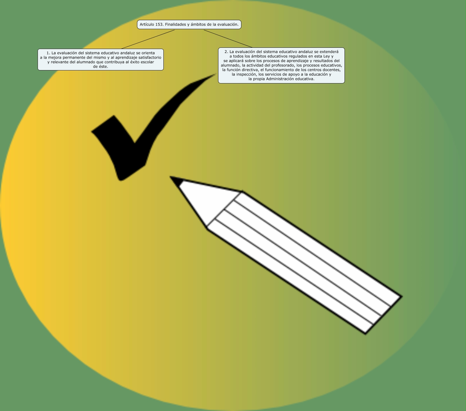 Este Cmap, tiene información relacionada con: LEA_art153, Artículo 153. Finalidades y ámbitos de la evaluación. ???? 1. La evaluación del sistema educativo andaluz se orienta a la mejora permanente del mismo y al aprendizaje satisfactorio y relevante del alumnado que contribuya al éxito escolar de éste., Artículo 153. Finalidades y ámbitos de la evaluación. ???? 2. La evaluación del sistema educativo andaluz se extenderá a todos los ámbitos educativos regulados en esta Ley y se aplicará sobre los procesos de aprendizaje y resultados del alumnado, la actividad del profesorado, los procesos educativos, la función directiva, el funcionamiento de los centros docentes, la inspección, los servicios de apoyo a la educación y la propia Administración educativa.