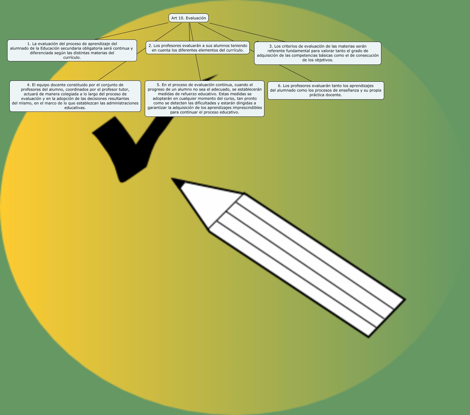 Este Cmap, tiene información relacionada con: 1631_art10, Art 10. Evaluación ???? 6. Los profesores evaluarán tanto los aprendizajes del alumnado como los procesos de enseñanza y su propia práctica docente., Art 10. Evaluación ???? 1. La evaluación del proceso de aprendizaje del alumnado de la Educación secundaria obligatoria será continua y diferenciada según las distintas materias del currículo., Art 10. Evaluación ???? 4. El equipo docente constituido por el conjunto de profesores del alumno, coordinados por el profesor tutor, actuará de manera colegiada a lo largo del proceso de evaluación y en la adopción de las decisiones resultantes del mismo, en el marco de lo que establezcan las administraciones educativas., Art 10. Evaluación ???? 2. Los profesores evaluarán a sus alumnos teniendo en cuenta los diferentes elementos del currículo., Art 10. Evaluación ???? 5. En el proceso de evaluación continua, cuando el progreso de un alumno no sea el adecuado, se establecerán medidas de refuerzo educativo. Estas medidas se adoptarán en cualquier momento del curso, tan pronto como se detecten las dificultades y estarán dirigidas a garantizar la adquisición de los aprendizajes imprescindibles para continuar el proceso educativo., Art 10. Evaluación ???? 3. Los criterios de evaluación de las materias serán referente fundamental para valorar tanto el grado de adquisición de las competencias básicas como el de consecución de los objetivos.