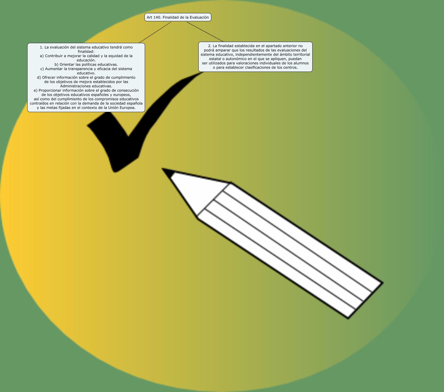 Este Cmap, tiene información relacionada con: LOE_art140, Art 140. Finalidad de la Evaluación ???? 2. La finalidad establecida en el apartado anterior no podrá amparar que los resultados de las evaluaciones del sistema educativo, independientemente del ámbito territorial estatal o autonómico en el que se apliquen, puedan ser utilizados para valoraciones individuales de los alumnos o para establecer clasificaciones de los centros., Art 140. Finalidad de la Evaluación ???? 1. La evaluación del sistema educativo tendrá como finalidad: a) Contribuir a mejorar la calidad y la equidad de la educación. b) Orientar las políticas educativas. c) Aumentar la transparencia y eficacia del sistema educativo. d) Ofrecer información sobre el grado de cumplimiento de los objetivos de mejora establecidos por las Administraciones educativas. e) Proporcionar información sobre el grado de consecución de los objetivos educativos españoles y europeos, así como del cumplimiento de los compromisos educativos contraídos en relación con la demanda de la sociedad española y las metas fijadas en el contexto de la Unión Europea.