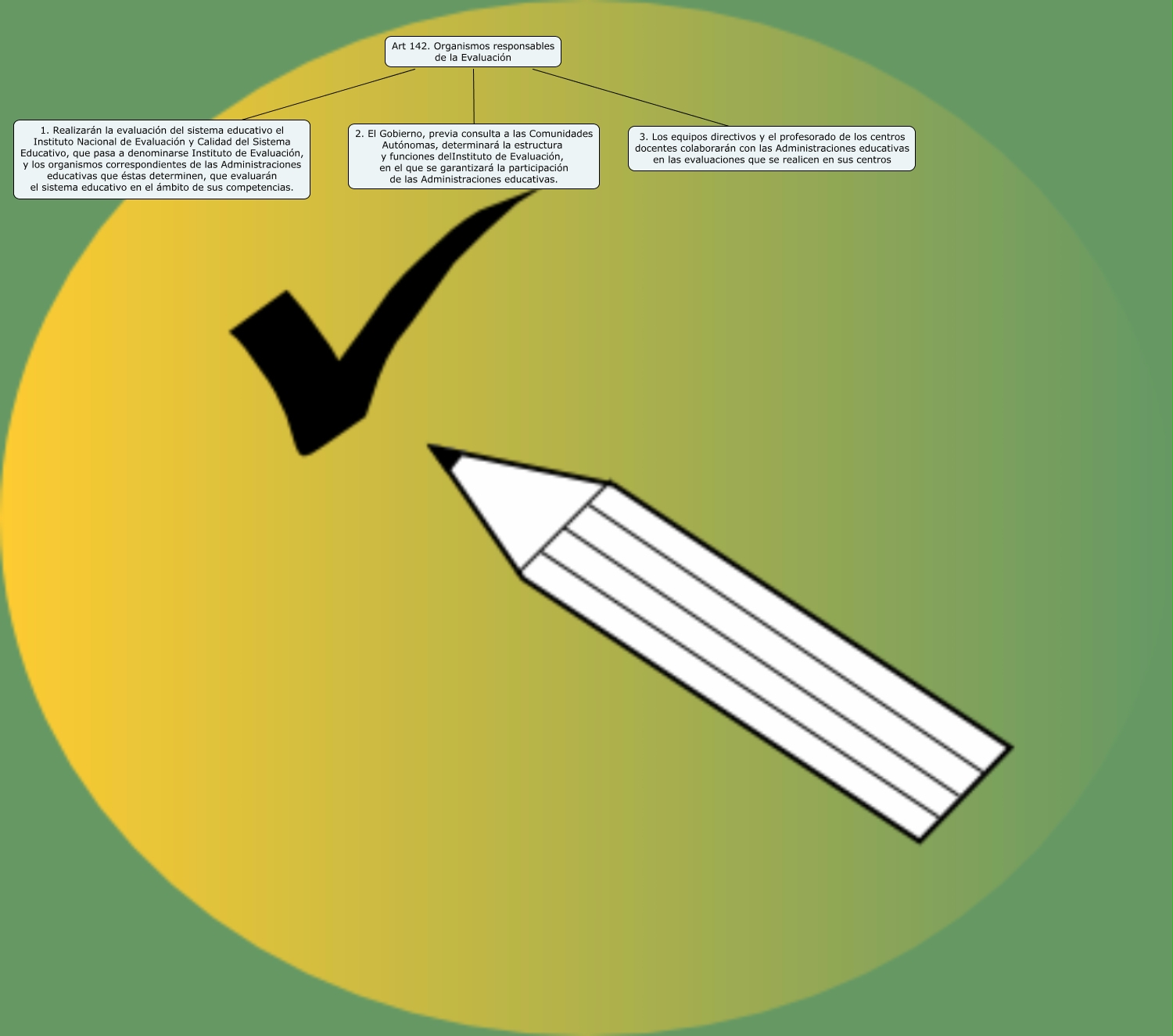 Este Cmap, tiene información relacionada con: LOE_art142, Art 142. Organismos responsables de la Evaluación ???? 3. Los equipos directivos y el profesorado de los centros docentes colaborarán con las Administraciones educativas en las evaluaciones que se realicen en sus centros, Art 142. Organismos responsables de la Evaluación ???? 1. Realizarán la evaluación del sistema educativo el Instituto Nacional de Evaluación y Calidad del Sistema Educativo, que pasa a denominarse Instituto de Evaluación, y los organismos correspondientes de las Administraciones educativas que éstas determinen, que evaluarán el sistema educativo en el ámbito de sus competencias., Art 142. Organismos responsables de la Evaluación ???? 2. El Gobierno, previa consulta a las Comunidades Autónomas, determinará la estructura y funciones delInstituto de Evaluación, en el que se garantizará la participación de las Administraciones educativas.