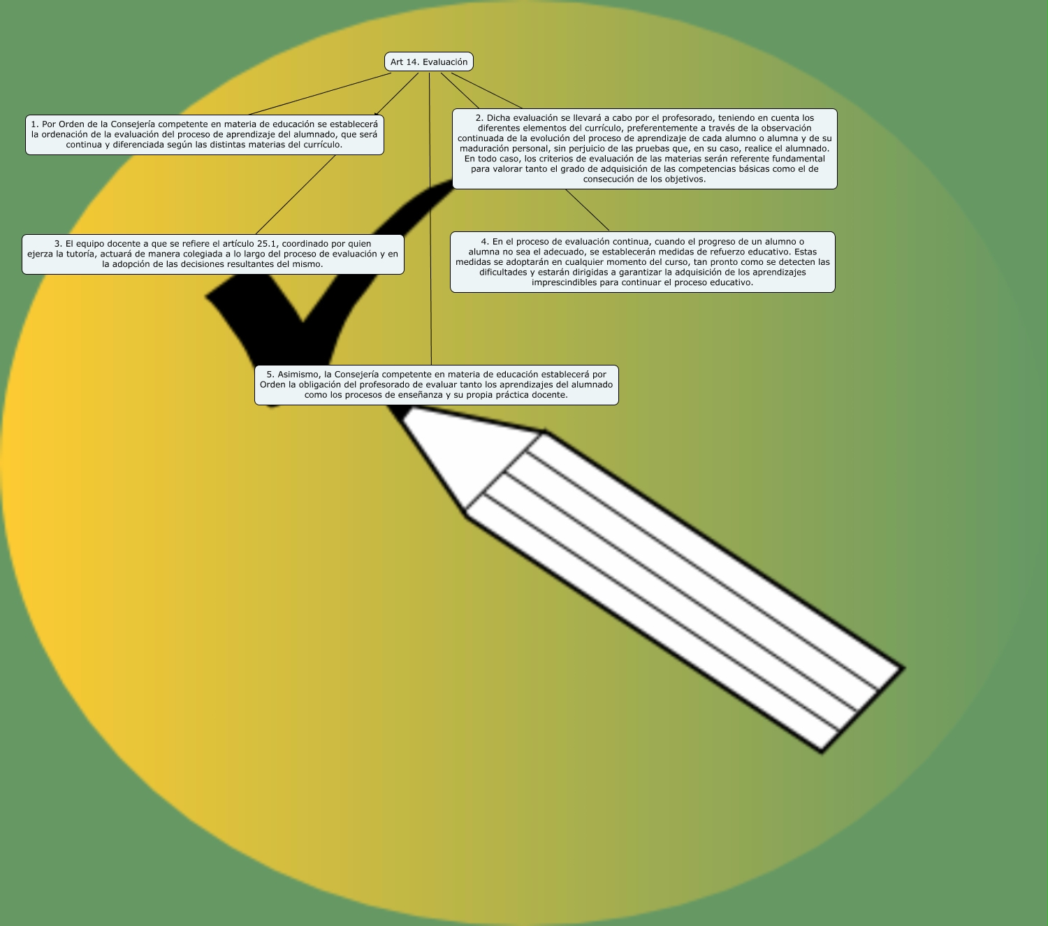 Este Cmap, tiene información relacionada con: 231_art14, Art 14. Evaluación ???? 4. En el proceso de evaluación continua, cuando el progreso de un alumno o alumna no sea el adecuado, se establecerán medidas de refuerzo educativo. Estas medidas se adoptarán en cualquier momento del curso, tan pronto como se detecten las dificultades y estarán dirigidas a garantizar la adquisición de los aprendizajes imprescindibles para continuar el proceso educativo., Art 14. Evaluación ???? 2. Dicha evaluación se llevará a cabo por el profesorado, teniendo en cuenta los diferentes elementos del currículo, preferentemente a través de la observación continuada de la evolución del proceso de aprendizaje de cada alumno o alumna y de su maduración personal, sin perjuicio de las pruebas que, en su caso, realice el alumnado. En todo caso, los criterios de evaluación de las materias serán referente fundamental para valorar tanto el grado de adquisición de las competencias básicas como el de consecución de los objetivos., Art 14. Evaluación ???? 3. El equipo docente a que se refiere el artículo 25.1, coordinado por quien ejerza la tutoría, actuará de manera colegiada a lo largo del proceso de evaluación y en la adopción de las decisiones resultantes del mismo., Art 14. Evaluación ???? 1. Por Orden de la Consejería competente en materia de educación se establecerá la ordenación de la evaluación del proceso de aprendizaje del alumnado, que será continua y diferenciada según las distintas materias del currículo., Art 14. Evaluación ???? 5. Asimismo, la Consejería competente en materia de educación establecerá por Orden la obligación del profesorado de evaluar tanto los aprendizajes del alumnado como los procesos de enseñanza y su propia práctica docente.