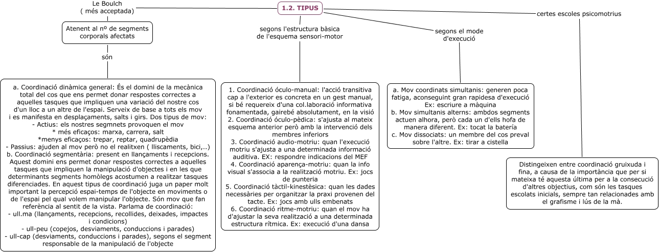 Este Cmap, tiene información relacionada con: 1.2. Tipus, 1.2. TIPUS Le Boulch ( més acceptada) Atenent al nº de segments corporals afectats, Atenent al nº de segments corporals afectats són a. Coordinació dinàmica general: És el domini de la mecànica total del cos que ens permet donar respostes correctes a aquelles tasques que impliquen una variació del nostre cos d'un lloc a un altre de l'espai. Serveix de base a tots els mov i es manifesta en desplaçaments, salts i girs. Dos tipus de mov: - Actius: els nostres segmnets provoquen el mov * més eficaços: marxa, carrera, salt *menys eficaços: trepar, reptar, quadrupèdia - Passius: ajuden al mov però no el realitxen ( lliscaments, bici,..) b. Coordinació segmentària: present en llançaments i recepcions. Aquest domini ens permet donar respostes correctes a aquelles tasques que impliquen la manipulació d'objectes i en les que determinants segments homòlegs acostumen a realitzar tasques diferenciades. En aquest tipus de coordinació juga un paper molt important la percepció espai-temps de l'objecte en moviments o de l'espai pel qual volem manipular l'objecte. Són mov que fan referència al sentit de la vista. Parlama de coordinació: - ull.ma (llançaments, recepcions, recollides, deixades, impactes i condicions) - ull-peu (copejos, desviaments, conduccions i parades) - ull-cap (desviaments, conduccions i parades), segons el segment responsable de la manipulació de l'objecte, 1.2. TIPUS segons l'estructura bàsica de l'esquema sensori-motor 1. Coordinació óculo-manual: l'acció transitiva cap a l'exterior es concreta en un gest manual, si bé requereix d'una col.laboració informativa fonamentada, gairebé absolutament, en la visió 2. Coordinació óculo-pèdica: s'ajusta al mateix esquema anterior però amb la intervenció dels membres inferiors 3. Coordinació audio-motriu: quan l'execució motriu s'ajusta a una determinada informació auditiva. EX: respondre indicacions del MEF 4. Coordinació aparença-motriu: quan la info visual s'associa a la realització motriu. Ex: jocs de punteria 5. Coordinació tàctil-kinestèsica: quan les dades necessàries per organitzar la praxi provenen del tacte. Ex: jocs amb ulls embenats 6. Coordinació ritme-motriu: quan el mov ha d'ajustar la seva realització a una determinada estructura rítmica. Ex: execució d'una dansa, 1.2. TIPUS certes escoles psicomotrius Distingeixen entre coordinació gruixuda i fina, a causa de la importància que per si mateixa té aquesta última per a la consecució d'altres objectius, com són les tasques escolats inicials, sempre tan relacionades amb el grafisme i lús de la mà., 1.2. TIPUS segons el mode d'execució a. Mov coordinats simultanis: generen poca fatiga, aconseguint gran rapidesa d'execució Ex: escriure a màquina b. Mov simultanis alterns: ambdos segments actuen alhora, però cada un d'ells hofa de manera diferent. Ex: tocat la batería c. Mov dissociats: un membre del cos preval sobre l'altre. Ex: tirar a cistella