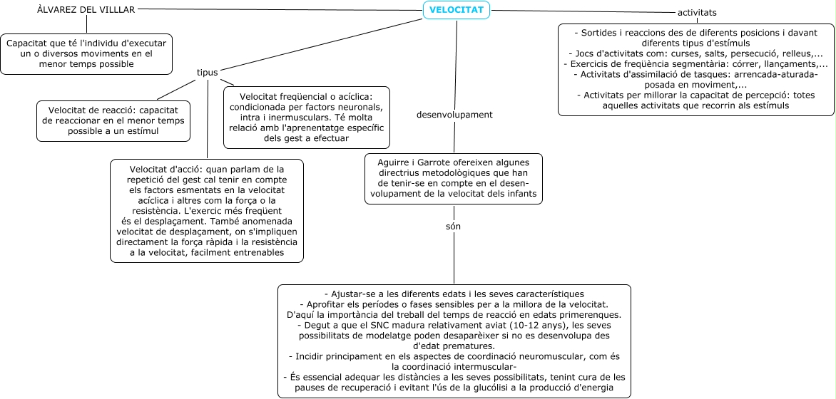 Este Cmap, tiene información relacionada con: Velocitat, VELOCITAT ÀLVAREZ DEL VILLLAR Capacitat que té l'individu d'executar un o diversos moviments en el menor temps possible, VELOCITAT desenvolupament Aguirre i Garrote ofereixen algunes directrius metodològiques que han de tenir-se en compte en el desen- volupament de la velocitat dels infants, Aguirre i Garrote ofereixen algunes directrius metodològiques que han de tenir-se en compte en el desen- volupament de la velocitat dels infants són - Ajustar-se a les diferents edats i les seves característiques - Aprofitar els períodes o fases sensibles per a la millora de la velocitat. D'aquí la importància del treball del temps de reacció en edats primerenques. - Degut a que el SNC madura relativament aviat (10-12 anys), les seves possibilitats de modelatge poden desaparèixer si no es desenvolupa des d'edat prematures. - Incidir principament en els aspectes de coordinació neuromuscular, com és la coordinació intermuscular- - És essencial adequar les distàncies a les seves possibilitats, tenint cura de les pauses de recuperació i evitant l'ús de la glucólisi a la producció d'energia, VELOCITAT tipus Velocitat de reacció: capacitat de reaccionar en el menor temps possible a un estímul, VELOCITAT activitats - Sortides i reaccions des de diferents posicions i davant diferents tipus d'estímuls - Jocs d'activitats com: curses, salts, persecució, relleus,... - Exercicis de freqüència segmentària: córrer, llançaments,... - Activitats d'assimilació de tasques: arrencada-aturada- posada en moviment,... - Activitats per millorar la capacitat de percepció: totes aquelles activitats que recorrin als estímuls, VELOCITAT tipus Velocitat freqüencial o acíclica: condicionada per factors neuronals, intra i inermusculars. Té molta relació amb l'aprenentatge específic dels gest a efectuar, VELOCITAT tipus Velocitat d'acció: quan parlam de la repetició del gest cal tenir en compte els factors esmentats en la velocitat acíclica i altres com la força o la resistència. L'exercic més freqüent és el desplaçament. També anomenada velocitat de desplaçament, on s'impliquen directament la força ràpida i la resistència a la velocitat, facilment entrenables