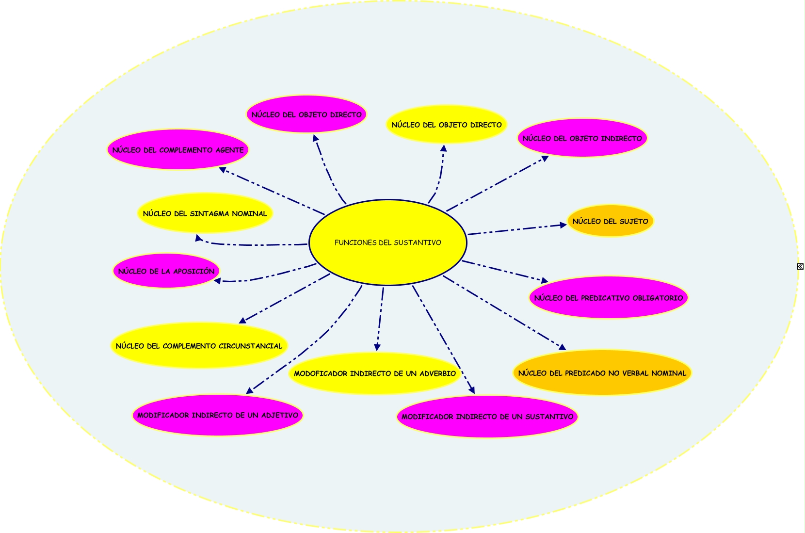 Este Cmap, tiene información relacionada con: FUNCIONES DEL SUSTANTIVO, FUNCIONES ???? FUNCIONES DEL SUSTANTIVO, FUNCIONES DEL SUSTANTIVO NÚCLEO DEL COMPLEMENTO AGENTE, FUNCIONES DEL SUSTANTIVO NÚCLEO DEL PREDICATIVO OBLIGATORIO, FUNCIONES DEL SUSTANTIVO NÚCLEO DEL OBJETO DIRECTO, FUNCIONES DEL SUSTANTIVO MODOFICADOR INDIRECTO DE UN ADVERBIO, FUNCIONES DEL SUSTANTIVO NÚCLEO DE LA APOSICIÓN, FUNCIONES DEL SUSTANTIVO NÚCLEO DEL PREDICADO NO VERBAL NOMINAL, FUNCIONES DEL SUSTANTIVO NÚCLEO DEL SINTAGMA NOMINAL, FUNCIONES DEL SUSTANTIVO NÚCLEO DEL COMPLEMENTO CIRCUNSTANCIAL, FUNCIONES DEL SUSTANTIVO MODIFICADOR INDIRECTO DE UN SUSTANTIVO, FUNCIONES DEL SUSTANTIVO MODIFICADOR INDIRECTO DE UN ADJETIVO, FUNCIONES DEL SUSTANTIVO NÚCLEO DEL SUJETO, FUNCIONES DEL SUSTANTIVO NÚCLEO DEL OBJETO INDIRECTO, FUNCIONES DEL SUSTANTIVO NÚCLEO DEL OBJETO DIRECTO