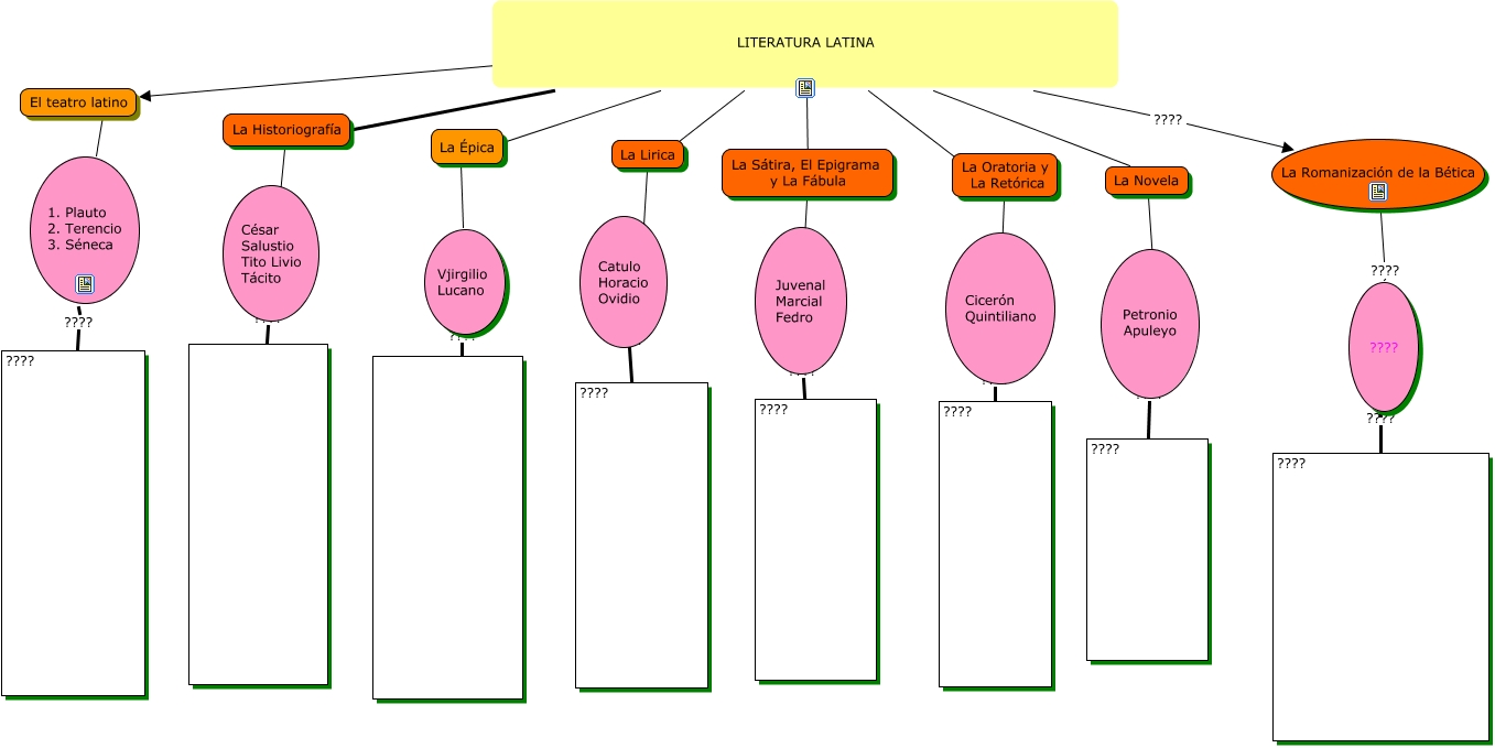 Este Cmap, tiene información relacionada con: literatura latina1, LITERATURA LATINA ???? La Historiografía, La Historiografía ???? César Salustio Tito Livio Tácito, LITERATURA LATINA ???? El teatro latino, La Sátira, El Epigrama y La Fábula ???? Juvenal Marcial Fedro, ???? ???? ????, Cicerón Quintiliano ???? ????, Catulo Horacio Ovidio ???? ????, El teatro latino ???? 1. Plauto 2. Terencio 3. Séneca, Juvenal Marcial Fedro ???? ????, La Épica ???? Vjirgilio Lucano, Vjirgilio Lucano ????, César Salustio Tito Livio Tácito ???? ????, LITERATURA LATINA ???? La Épica, La Lirica ???? Catulo Horacio Ovidio, La Novela ???? Petronio Apuleyo, 1. Plauto 2. Terencio 3. Séneca ???? ????, La Oratoria y La Retórica ???? Cicerón Quintiliano, LITERATURA LATINA ???? La Sátira, El Epigrama y La Fábula, La Romanización de la Bética ???? ????, Petronio Apuleyo ???? ????
