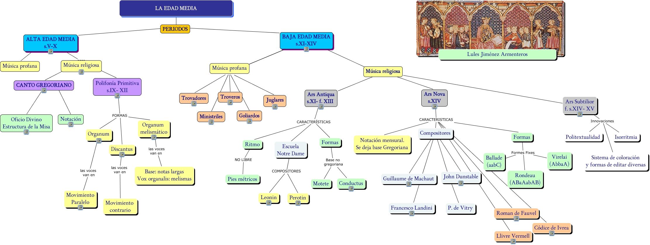 Este Cmap, tiene información relacionada con: Edad Media, Organum melismático las voces van en Base: notas largas Vox organalis: melismas, BAJA EDAD MEDIA s.XI-XIV ???? Troveros, Escuela Notre Dame COMPOSITORES Perotin, Compositores ???? P. de Vitry, Polifonía Primitiva s.IX- XII FORMAS Organum melismático, BAJA EDAD MEDIA s.XI-XIV ???? Trovadores, ALTA EDAD MEDIA s.V-X ???? Música profana, Ars Subtilior f. s.XIV- XV Innovaciones Sistema de coloración y formas de editar diversas, Compositores ???? Guillaume de Machaut, Ritmo NO LIBRE Pies métricos, CANTO GREGORIANO ???? Notación, Formas Formes Fixes Rondeau (ABaAabAB), Ars Subtilior f. s.XIV- XV Innovaciones Politextualidad, Ars Nova s.XIV CARACTERISTICAS Notación mensural. Se deja base Gregoriana, Ars Nova s.XIV CARACTERISTICAS Llivre Vermell, Música religiosa ???? Ars Subtilior f. s.XIV- XV, BAJA EDAD MEDIA s.XI-XIV ???? Música profana, Compositores ???? John Dunstable, Escuela Notre Dame COMPOSITORES Leonin, Ars Antiqua s.XI- f. XIII CARACTERÍSTICAS Ritmo
