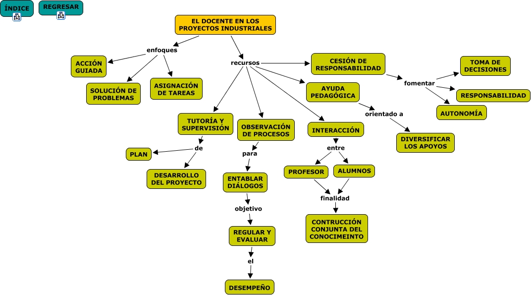 Este Cmap, tiene información relacionada con: PAPEL DOCENTE EN PROYECTOS INDUSTRIALES, EL DOCENTE EN LOS PROYECTOS INDUSTRIALES recursos CESIÓN DE RESPONSABILIDAD, INTERACCIÓN entre PROFESOR, CESIÓN DE RESPONSABILIDAD fomentar RESPONSABILIDAD, AYUDA PEDAGÓGICA orientado a DIVERSIFICAR LOS APOYOS, TUTORÍA Y SUPERVISIÓN de PLAN, ENTABLAR DIÁLOGOS objetivo REGULAR Y EVALUAR, CESIÓN DE RESPONSABILIDAD fomentar AUTONOMÍA, TUTORÍA Y SUPERVISIÓN de DESARROLLO DEL PROYECTO, REGULAR Y EVALUAR el DESEMPEÑO, EL DOCENTE EN LOS PROYECTOS INDUSTRIALES recursos AYUDA PEDAGÓGICA, EL DOCENTE EN LOS PROYECTOS INDUSTRIALES enfoques ACCIÓN GUIADA, EL DOCENTE EN LOS PROYECTOS INDUSTRIALES recursos INTERACCIÓN, ALUMNOS finalidad CONTRUCCIÓN CONJUNTA DEL CONOCIMEINTO, EL DOCENTE EN LOS PROYECTOS INDUSTRIALES enfoques ASIGNACIÓN DE TAREAS, OBSERVACIÓN DE PROCESOS para ENTABLAR DIÁLOGOS, INTERACCIÓN entre ALUMNOS, CESIÓN DE RESPONSABILIDAD fomentar TOMA DE DECISIONES, PROFESOR finalidad CONTRUCCIÓN CONJUNTA DEL CONOCIMEINTO, EL DOCENTE EN LOS PROYECTOS INDUSTRIALES recursos OBSERVACIÓN DE PROCESOS, EL DOCENTE EN LOS PROYECTOS INDUSTRIALES enfoques SOLUCIÓN DE PROBLEMAS