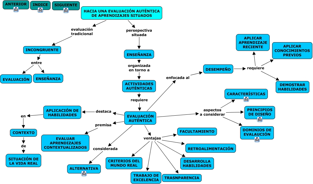 Este Cmap, tiene información relacionada con: EVALUACIÓN DE APRENDIZAJES SITUADOS, HACIA UNA EVALUACIÓN AUTÉNTICA DE APRENDIZAJES SITUADOS persepectiva situada ENSEÑANZA, ENSEÑANZA organizada en torno a ACTIVIDADES AUTÉNTICAS, EVALUACIÓN AUTÉNTICA ventajas TRASNPARENCIA, EVALUACIÓN AUTÉNTICA ventajas DESARROLLA HABILIDADES, EVALUACIÓN AUTÉNTICA aspectos a considerar DOMINIOS DE EVALAUCIÓN, EVALUACIÓN AUTÉNTICA destaca APLICACIÓN DE HABILIDADES, EVALUACIÓN AUTÉNTICA ventajas TRABAJO DE EXCELENCIA, DESEMPEÑO requiere APLICAR APRENDIZAJE RECIENTE, EVALUACIÓN AUTÉNTICA considerada ALTERNATIVA, DESEMPEÑO requiere DEMOSTRAR HABILIDADES, INCONGRUENTE entre EVALUACIÓN, EVALUACIÓN AUTÉNTICA ventajas FACULTAMIENTO, EVALUACIÓN AUTÉNTICA aspectos a considerar CARACTERÍSTICAS, EVALUACIÓN AUTÉNTICA enfocada al DESEMPEÑO, INCONGRUENTE entre ENSEÑANZA, EVALUACIÓN AUTÉNTICA premisa EVALUAR APRENDIZAJES CONTEXTUALIZADOS, EVALUACIÓN AUTÉNTICA ventajas CRITERIOS DEL MUNDO REAL, EVALUACIÓN AUTÉNTICA ventajas RETROALIMENTACIÓN, CONTEXTO de SITUACIÓN DE LA VIDA REAL, EVALUACIÓN AUTÉNTICA aspectos a considerar PRINCIPIOS DE DISEÑO
