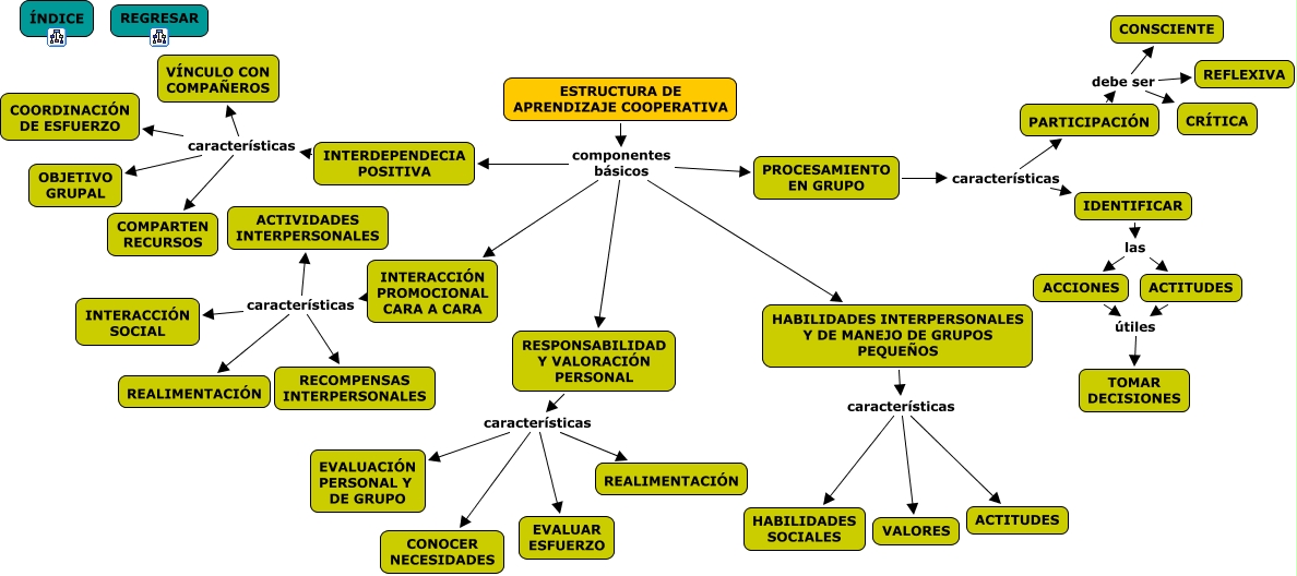 Este Cmap, tiene información relacionada con: COMPONENTES BÁSICOAS DEL APRENDIZAJE COOPERATIVO, INTERDEPENDECIA POSITIVA características VÍNCULO CON COMPAÑEROS, PROCESAMIENTO EN GRUPO características IDENTIFICAR, INTERACCIÓN PROMOCIONAL CARA A CARA características INTERACCIÓN SOCIAL, ESTRUCTURA DE APRENDIZAJE COOPERATIVA componentes básicos PROCESAMIENTO EN GRUPO, ESTRUCTURA DE APRENDIZAJE COOPERATIVA componentes básicos INTERDEPENDECIA POSITIVA, INTERDEPENDECIA POSITIVA características COORDINACIÓN DE ESFUERZO, INTERACCIÓN PROMOCIONAL CARA A CARA características RECOMPENSAS INTERPERSONALES, INTERACCIÓN PROMOCIONAL CARA A CARA características ACTIVIDADES INTERPERSONALES, ESTRUCTURA DE APRENDIZAJE COOPERATIVA componentes básicos INTERACCIÓN PROMOCIONAL CARA A CARA, INTERDEPENDECIA POSITIVA características OBJETIVO GRUPAL, IDENTIFICAR las ACCIONES, RESPONSABILIDAD Y VALORACIÓN PERSONAL características EVALUAR ESFUERZO, ACTITUDES útiles TOMAR DECISIONES, PARTICIPACIÓN debe ser CRÍTICA, HABILIDADES INTERPERSONALES Y DE MANEJO DE GRUPOS PEQUEÑOS características HABILIDADES SOCIALES, RESPONSABILIDAD Y VALORACIÓN PERSONAL características EVALUACIÓN PERSONAL Y DE GRUPO, PARTICIPACIÓN debe ser REFLEXIVA, HABILIDADES INTERPERSONALES Y DE MANEJO DE GRUPOS PEQUEÑOS características VALORES, ESTRUCTURA DE APRENDIZAJE COOPERATIVA componentes básicos RESPONSABILIDAD Y VALORACIÓN PERSONAL, ACCIONES útiles TOMAR DECISIONES