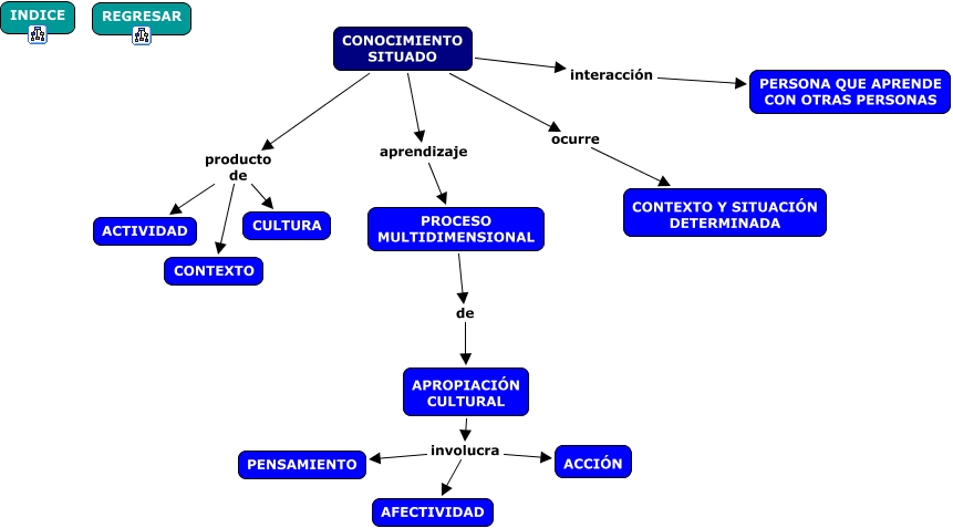 Este Cmap, tiene información relacionada con: CONOCIMIENTO SITUADO, CONOCIMIENTO SITUADO producto de CONTEXTO, PROCESO MULTIDIMENSIONAL de APROPIACIÓN CULTURAL, APROPIACIÓN CULTURAL involucra ACCIÓN, CONOCIMIENTO SITUADO ocurre CONTEXTO Y SITUACIÓN DETERMINADA, CONOCIMIENTO SITUADO producto de CULTURA, CONOCIMIENTO SITUADO aprendizaje PROCESO MULTIDIMENSIONAL, CONOCIMIENTO SITUADO producto de ACTIVIDAD, APROPIACIÓN CULTURAL involucra AFECTIVIDAD, APROPIACIÓN CULTURAL involucra PENSAMIENTO, CONOCIMIENTO SITUADO interacción PERSONA QUE APRENDE CON OTRAS PERSONAS