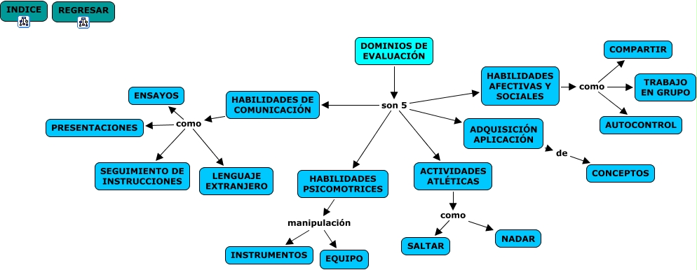 Este Cmap, tiene información relacionada con: DOMINIOS DE EVALUACIÓN, HABILIDADES DE COMUNICACIÓN como SEGUIMIENTO DE INSTRUCCIONES, DOMINIOS DE EVALUACIÓN son 5 ADQUISICIÓN APLICACIÓN, HABILIDADES AFECTIVAS Y SOCIALES como AUTOCONTROL, DOMINIOS DE EVALUACIÓN son 5 ACTIVIDADES ATLÉTICAS, HABILIDADES PSICOMOTRICES manipulación INSTRUMENTOS, HABILIDADES AFECTIVAS Y SOCIALES como COMPARTIR, HABILIDADES DE COMUNICACIÓN como PRESENTACIONES, HABILIDADES DE COMUNICACIÓN como LENGUAJE EXTRANJERO, HABILIDADES AFECTIVAS Y SOCIALES como TRABAJO EN GRUPO, HABILIDADES DE COMUNICACIÓN como ENSAYOS, DOMINIOS DE EVALUACIÓN son 5 HABILIDADES DE COMUNICACIÓN, ACTIVIDADES ATLÉTICAS como SALTAR, HABILIDADES PSICOMOTRICES manipulación EQUIPO, DOMINIOS DE EVALUACIÓN son 5 HABILIDADES PSICOMOTRICES, ACTIVIDADES ATLÉTICAS como NADAR, ADQUISICIÓN APLICACIÓN de CONCEPTOS, DOMINIOS DE EVALUACIÓN son 5 HABILIDADES AFECTIVAS Y SOCIALES