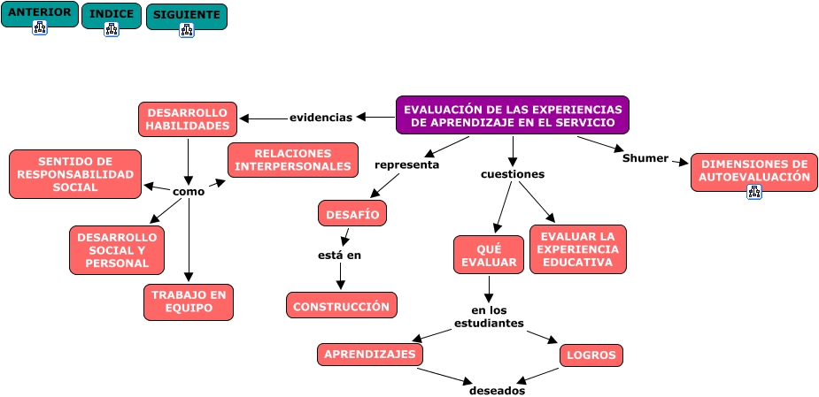 Este Cmap, tiene información relacionada con: EVALUACIÓN, EVALUACIÓN DE LAS EXPERIENCIAS DE APRENDIZAJE EN EL SERVICIO cuestiones EVALUAR LA EXPERIENCIA EDUCATIVA, QUÉ EVALUAR en los estudiantes APRENDIZAJES, DESAFÍO está en CONSTRUCCIÓN, DESARROLLO HABILIDADES como DESARROLLO SOCIAL Y PERSONAL, EVALUACIÓN DE LAS EXPERIENCIAS DE APRENDIZAJE EN EL SERVICIO representa DESAFÍO, EVALUACIÓN DE LAS EXPERIENCIAS DE APRENDIZAJE EN EL SERVICIO evidencias DESARROLLO HABILIDADES, DESARROLLO HABILIDADES como RELACIONES INTERPERSONALES, EVALUACIÓN DE LAS EXPERIENCIAS DE APRENDIZAJE EN EL SERVICIO cuestiones QUÉ EVALUAR, DESARROLLO HABILIDADES como SENTIDO DE RESPONSABILIDAD SOCIAL, EVALUACIÓN DE LAS EXPERIENCIAS DE APRENDIZAJE EN EL SERVICIO Shumer DIMENSIONES DE AUTOEVALUACIÓN, DESARROLLO HABILIDADES como TRABAJO EN EQUIPO, QUÉ EVALUAR en los estudiantes LOGROS