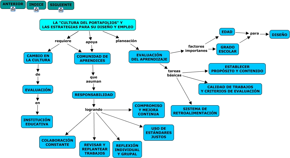 Este Cmap, tiene información relacionada con: LA CULTURA DEL PORTAFOLIOS, LA "CULTURA DEL PORTAFOLIOS" Y LAS ESTRATEGIAS PARA SU DISEÑO Y EMPLEO apoya COMUNIDAD DE APRENDICES, EVALUACIÓN DEL APRENDIZAJE tareas básicas ESTABLECER PROPÓSITO Y CONTENIDO, EVALUACIÓN DEL APRENDIZAJE factores importanes EDAD, RESPONSABILIDAD logrando REVISAR Y REPLANTEAR TRABAJOS, LA "CULTURA DEL PORTAFOLIOS" Y LAS ESTRATEGIAS PARA SU DISEÑO Y EMPLEO requiere CAMBIO EN LA CULTURA, LA "CULTURA DEL PORTAFOLIOS" Y LAS ESTRATEGIAS PARA SU DISEÑO Y EMPLEO requiere CAMBIO EN LA CULTURA, EVALUACIÓN en INSTITUCIÓN EDUCATIVA, RESPONSABILIDAD logrando COMPROMISO Y MEJORA CONTINUA, RESPONSABILIDAD logrando REFLEXIÓN INDIVIDUAL Y GRUPAL, EVALUACIÓN DEL APRENDIZAJE factores importanes GRADO ESCOLAR, EDAD para DISEÑO, GRADO ESCOLAR para DISEÑO, RESPONSABILIDAD logrando USO DE ESTÁNDARES JUSTOS, EVALUACIÓN DEL APRENDIZAJE tareas básicas CALIDAD DE TRABAJOS Y CRITERIOS DE EVALUACIÓN, LA "CULTURA DEL PORTAFOLIOS" Y LAS ESTRATEGIAS PARA SU DISEÑO Y EMPLEO planeación EVALUACIÓN DEL APRENDIZAJE, COMUNIDAD DE APRENDICES que asuman RESPONSABILIDAD, RESPONSABILIDAD logrando COLABORACIÓN CONSTANTE, EVALUACIÓN DEL APRENDIZAJE tareas básicas SISTEMA DE RETROALIMENTACIÓN, LA "CULTURA DEL PORTAFOLIOS" Y LAS ESTRATEGIAS PARA SU DISEÑO Y EMPLEO requiere COMUNIDAD DE APRENDICES, CAMBIO EN LA CULTURA de EVALUACIÓN