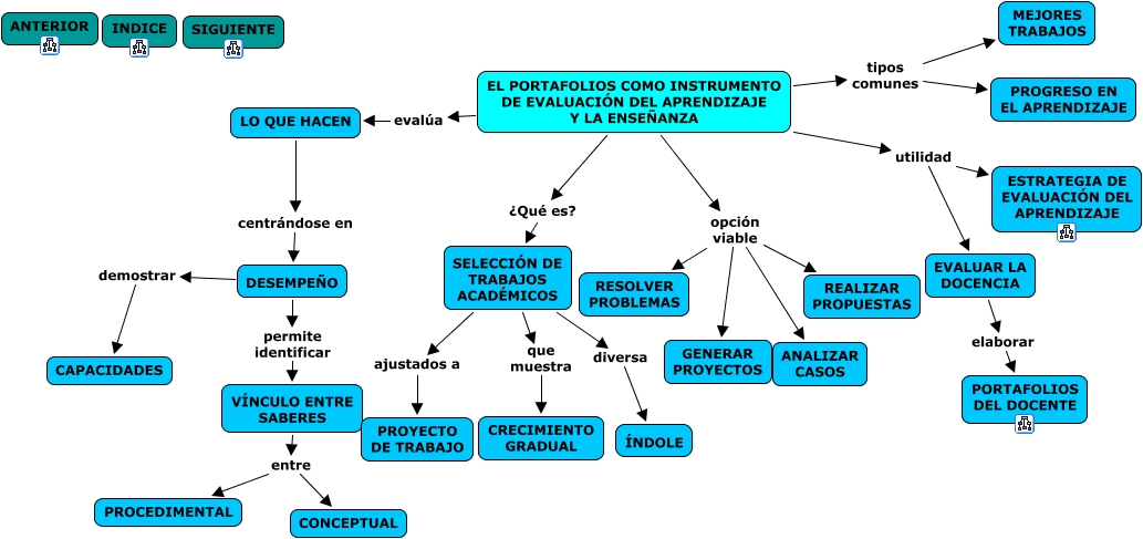 Este Cmap, tiene información relacionada con: EL PORTAFOLIOS, LO QUE HACEN centrándose en DESEMPEÑO, EL PORTAFOLIOS COMO INSTRUMENTO DE EVALUACIÓN DEL APRENDIZAJE Y LA ENSEÑANZA tipos comunes MEJORES TRABAJOS, SELECCIÓN DE TRABAJOS ACADÉMICOS ajustados a PROYECTO DE TRABAJO, DESEMPEÑO permite identificar VÍNCULO ENTRE SABERES, EL PORTAFOLIOS COMO INSTRUMENTO DE EVALUACIÓN DEL APRENDIZAJE Y LA ENSEÑANZA utilidad ESTRATEGIA DE EVALUACIÓN DEL APRENDIZAJE, EL PORTAFOLIOS COMO INSTRUMENTO DE EVALUACIÓN DEL APRENDIZAJE Y LA ENSEÑANZA evalúa LO QUE HACEN, EL PORTAFOLIOS COMO INSTRUMENTO DE EVALUACIÓN DEL APRENDIZAJE Y LA ENSEÑANZA opción viable REALIZAR PROPUESTAS, EL PORTAFOLIOS COMO INSTRUMENTO DE EVALUACIÓN DEL APRENDIZAJE Y LA ENSEÑANZA ¿Qué es? SELECCIÓN DE TRABAJOS ACADÉMICOS, EL PORTAFOLIOS COMO INSTRUMENTO DE EVALUACIÓN DEL APRENDIZAJE Y LA ENSEÑANZA opción viable ANALIZAR CASOS, EL PORTAFOLIOS COMO INSTRUMENTO DE EVALUACIÓN DEL APRENDIZAJE Y LA ENSEÑANZA opción viable GENERAR PROYECTOS, DESEMPEÑO demostrar CAPACIDADES, EL PORTAFOLIOS COMO INSTRUMENTO DE EVALUACIÓN DEL APRENDIZAJE Y LA ENSEÑANZA utilidad EVALUAR LA DOCENCIA, SELECCIÓN DE TRABAJOS ACADÉMICOS que muestra CRECIMIENTO GRADUAL, VÍNCULO ENTRE SABERES entre CONCEPTUAL, EL PORTAFOLIOS COMO INSTRUMENTO DE EVALUACIÓN DEL APRENDIZAJE Y LA ENSEÑANZA tipos comunes PROGRESO EN EL APRENDIZAJE, SELECCIÓN DE TRABAJOS ACADÉMICOS diversa ÍNDOLE, EVALUAR LA DOCENCIA elaborar PORTAFOLIOS DEL DOCENTE, VÍNCULO ENTRE SABERES entre PROCEDIMENTAL, EL PORTAFOLIOS COMO INSTRUMENTO DE EVALUACIÓN DEL APRENDIZAJE Y LA ENSEÑANZA opción viable RESOLVER PROBLEMAS