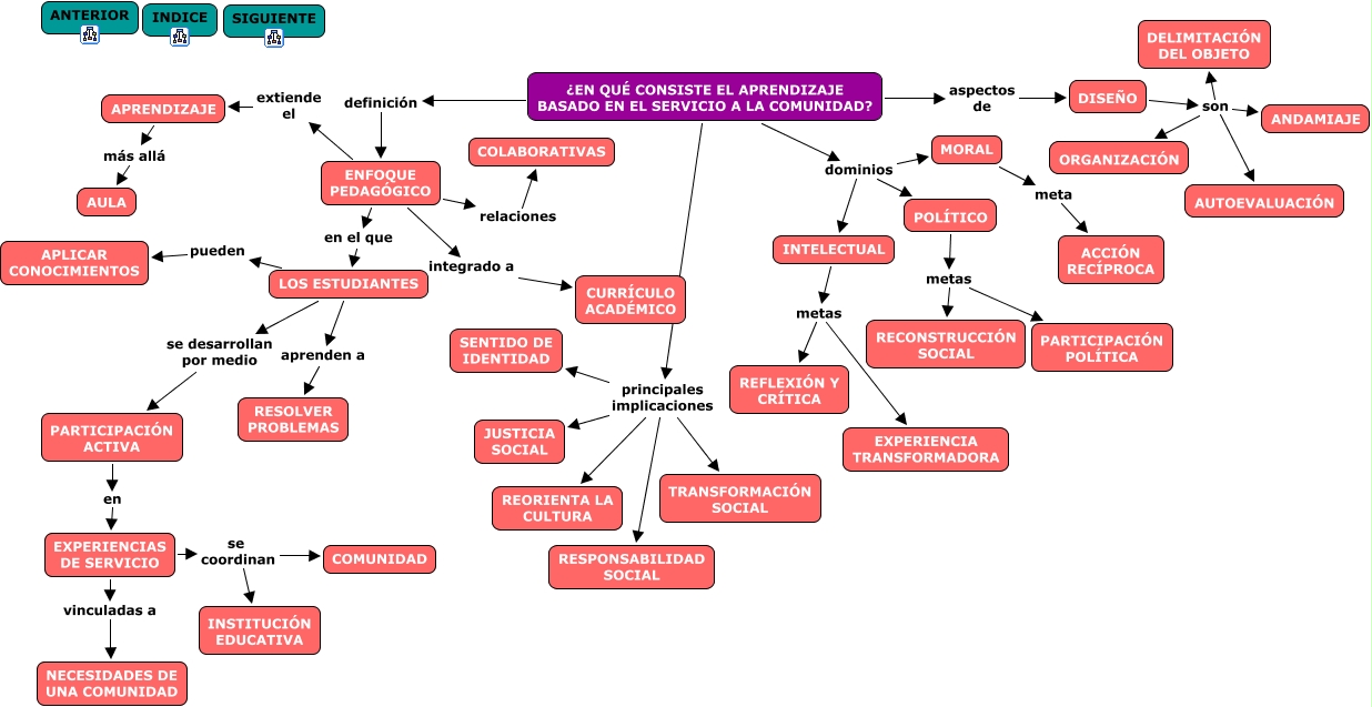 Este Cmap, tiene información relacionada con: EN QUÉ CONSISTE, INTELECTUAL metas REFLEXIÓN Y CRÍTICA, ENFOQUE PEDAGÓGICO extiende el APRENDIZAJE, DISEÑO son DELIMITACIÓN DEL OBJETO, ENFOQUE PEDAGÓGICO relaciones COLABORATIVAS, MORAL meta ACCIÓN RECÍPROCA, APRENDIZAJE más allá AULA, ¿EN QUÉ CONSISTE EL APRENDIZAJE BASADO EN EL SERVICIO A LA COMUNIDAD? dominios POLÍTICO, ¿EN QUÉ CONSISTE EL APRENDIZAJE BASADO EN EL SERVICIO A LA COMUNIDAD? principales implicaciones REORIENTA LA CULTURA, ¿EN QUÉ CONSISTE EL APRENDIZAJE BASADO EN EL SERVICIO A LA COMUNIDAD? principales implicaciones RESPONSABILIDAD SOCIAL, ¿EN QUÉ CONSISTE EL APRENDIZAJE BASADO EN EL SERVICIO A LA COMUNIDAD? aspectos de DISEÑO, ENFOQUE PEDAGÓGICO en el que LOS ESTUDIANTES, PARTICIPACIÓN ACTIVA en EXPERIENCIAS DE SERVICIO, EXPERIENCIAS DE SERVICIO se coordinan COMUNIDAD, ¿EN QUÉ CONSISTE EL APRENDIZAJE BASADO EN EL SERVICIO A LA COMUNIDAD? principales implicaciones SENTIDO DE IDENTIDAD, ¿EN QUÉ CONSISTE EL APRENDIZAJE BASADO EN EL SERVICIO A LA COMUNIDAD? principales implicaciones JUSTICIA SOCIAL, LOS ESTUDIANTES aprenden a RESOLVER PROBLEMAS, POLÍTICO metas RECONSTRUCCIÓN SOCIAL, ¿EN QUÉ CONSISTE EL APRENDIZAJE BASADO EN EL SERVICIO A LA COMUNIDAD? definición ENFOQUE PEDAGÓGICO, DISEÑO son AUTOEVALUACIÓN, POLÍTICO metas PARTICIPACIÓN POLÍTICA