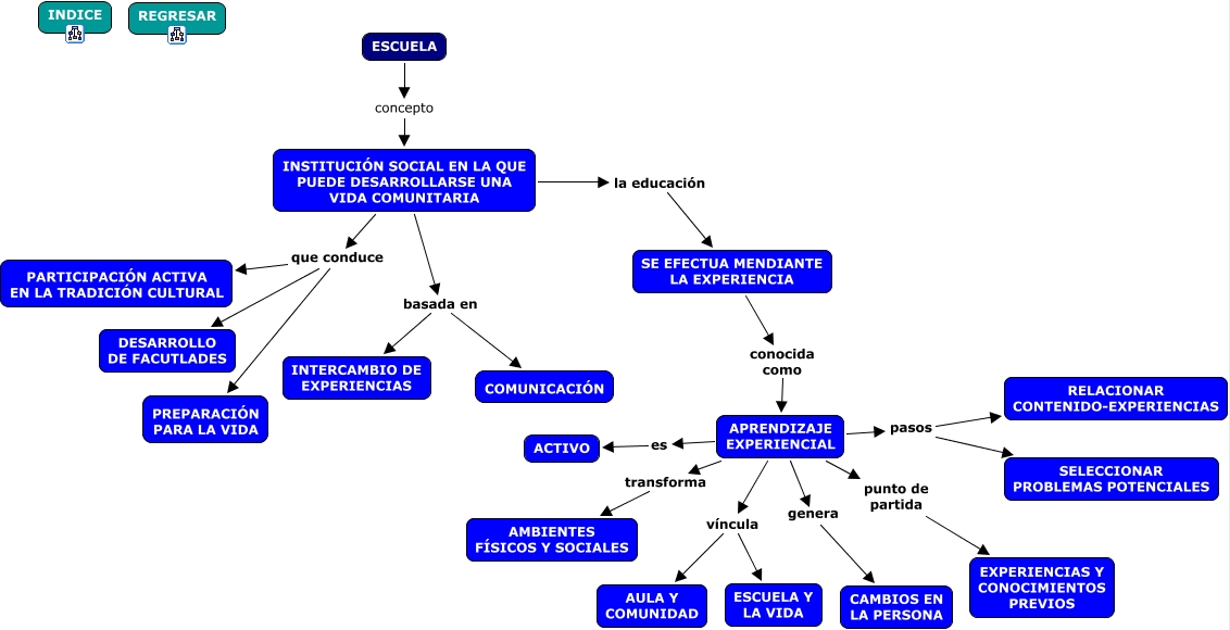 Este Cmap, tiene información relacionada con: CONCEPTO DE ESCUELA, APRENDIZAJE EXPERIENCIAL transforma AMBIENTES FÍSICOS Y SOCIALES, ESCUELA concepto INSTITUCIÓN SOCIAL EN LA QUE PUEDE DESARROLLARSE UNA VIDA COMUNITARIA, APRENDIZAJE EXPERIENCIAL genera CAMBIOS EN LA PERSONA, INSTITUCIÓN SOCIAL EN LA QUE PUEDE DESARROLLARSE UNA VIDA COMUNITARIA que conduce PREPARACIÓN PARA LA VIDA, INSTITUCIÓN SOCIAL EN LA QUE PUEDE DESARROLLARSE UNA VIDA COMUNITARIA que conduce PARTICIPACIÓN ACTIVA EN LA TRADICIÓN CULTURAL, INSTITUCIÓN SOCIAL EN LA QUE PUEDE DESARROLLARSE UNA VIDA COMUNITARIA basada en INTERCAMBIO DE EXPERIENCIAS, INSTITUCIÓN SOCIAL EN LA QUE PUEDE DESARROLLARSE UNA VIDA COMUNITARIA la educación SE EFECTUA MENDIANTE LA EXPERIENCIA, SE EFECTUA MENDIANTE LA EXPERIENCIA conocida como APRENDIZAJE EXPERIENCIAL, APRENDIZAJE EXPERIENCIAL pasos SELECCIONAR PROBLEMAS POTENCIALES, APRENDIZAJE EXPERIENCIAL punto de partida EXPERIENCIAS Y CONOCIMIENTOS PREVIOS, INSTITUCIÓN SOCIAL EN LA QUE PUEDE DESARROLLARSE UNA VIDA COMUNITARIA que conduce DESARROLLO DE FACUTLADES, APRENDIZAJE EXPERIENCIAL víncula ESCUELA Y LA VIDA, APRENDIZAJE EXPERIENCIAL es ACTIVO, APRENDIZAJE EXPERIENCIAL pasos RELACIONAR CONTENIDO-EXPERIENCIAS, APRENDIZAJE EXPERIENCIAL víncula AULA Y COMUNIDAD, INSTITUCIÓN SOCIAL EN LA QUE PUEDE DESARROLLARSE UNA VIDA COMUNITARIA basada en COMUNICACIÓN