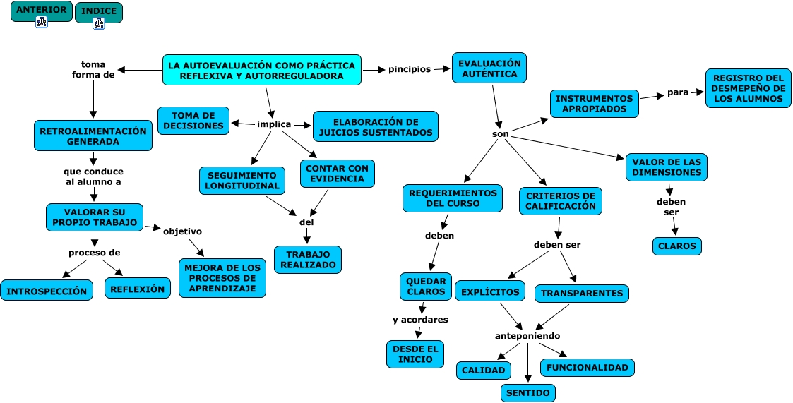 Este Cmap, tiene información relacionada con: AUTOEVALUACIÓN, LA AUTOEVALUACIÓN COMO PRÁCTICA REFLEXIVA Y AUTORREGULADORA toma forma de RETROALIMENTACIÓN GENERADA, VALOR DE LAS DIMENSIONES deben ser CLAROS, EVALUACIÓN AUTÉNTICA son CRITERIOS DE CALIFICACIÓN, VALORAR SU PROPIO TRABAJO objetivo MEJORA DE LOS PROCESOS DE APRENDIZAJE, EVALUACIÓN AUTÉNTICA son REQUERIMIENTOS DEL CURSO, TRANSPARENTES anteponiendo SENTIDO, TRANSPARENTES anteponiendo FUNCIONALIDAD, EVALUACIÓN AUTÉNTICA son VALOR DE LAS DIMENSIONES, EXPLÍCITOS anteponiendo FUNCIONALIDAD, CRITERIOS DE CALIFICACIÓN deben ser TRANSPARENTES, VALORAR SU PROPIO TRABAJO proceso de INTROSPECCIÓN, LA AUTOEVALUACIÓN COMO PRÁCTICA REFLEXIVA Y AUTORREGULADORA implica CONTAR CON EVIDENCIA, TRANSPARENTES anteponiendo CALIDAD, EVALUACIÓN AUTÉNTICA son INSTRUMENTOS APROPIADOS, REQUERIMIENTOS DEL CURSO deben QUEDAR CLAROS, CRITERIOS DE CALIFICACIÓN deben ser EXPLÍCITOS, LA AUTOEVALUACIÓN COMO PRÁCTICA REFLEXIVA Y AUTORREGULADORA implica TOMA DE DECISIONES, VALORAR SU PROPIO TRABAJO proceso de REFLEXIÓN, LA AUTOEVALUACIÓN COMO PRÁCTICA REFLEXIVA Y AUTORREGULADORA pincipios EVALUACIÓN AUTÉNTICA, QUEDAR CLAROS y acordares DESDE EL INICIO