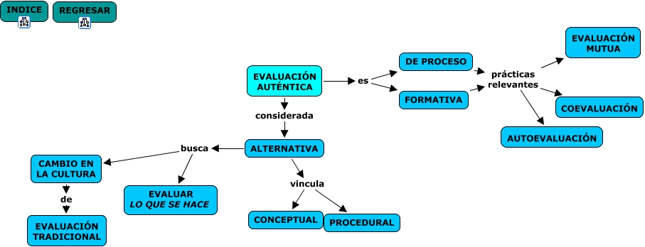 Este Cmap, tiene información relacionada con: EVALUACIÓN AUTÉNTICA ALTERNATIVA, EVALUACIÓN AUTÉNTICA es FORMATIVA, ALTERNATIVA vincula PROCEDURAL, FORMATIVA prácticas relevantes COEVALUACIÓN, ALTERNATIVA busca EVALUAR LO QUE SE HACE, DE PROCESO prácticas relevantes AUTOEVALUACIÓN, EVALUACIÓN AUTÉNTICA considerada ALTERNATIVA, CAMBIO EN LA CULTURA de EVALUACIÓN TRADICIONAL, DE PROCESO prácticas relevantes COEVALUACIÓN, DE PROCESO prácticas relevantes EVALUACIÓN MUTUA, ALTERNATIVA busca CAMBIO EN LA CULTURA, ALTERNATIVA vincula CONCEPTUAL, EVALUACIÓN AUTÉNTICA es DE PROCESO, FORMATIVA prácticas relevantes AUTOEVALUACIÓN, FORMATIVA prácticas relevantes EVALUACIÓN MUTUA