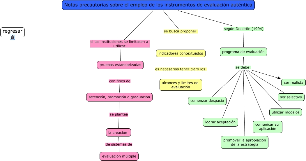 Este Cmap, tiene información relacionada con: cap 5, subt 8, programa de evaluación se debe comunicar su aplicación, indicadores contextuados es necesarios tener claro los alcances y limites de evaluación, programa de evaluación se debe promover la apropiación de la estrategia, programa de evaluación se debe comenzar despacio, la creación de sistemas de evaluación múltiple, Notas precautorias sobre el empleo de los instrumentos de evaluación auténtica se busca proponer indicadores contextuados, programa de evaluación se debe lograr aceptación, Notas precautorias sobre el empleo de los instrumentos de evaluación auténtica si las instituciones se limitasen a utilizar pruebas estandarizadas, programa de evaluación se debe ser realista, programa de evaluación se debe ser selectivo, retención, promoción o graduación se plantea la creación, Notas precautorias sobre el empleo de los instrumentos de evaluación auténtica según Doolittle (1994) programa de evaluación, programa de evaluación se debe utilizar modelos, pruebas estandarizadas con fines de retención, promoción o graduación