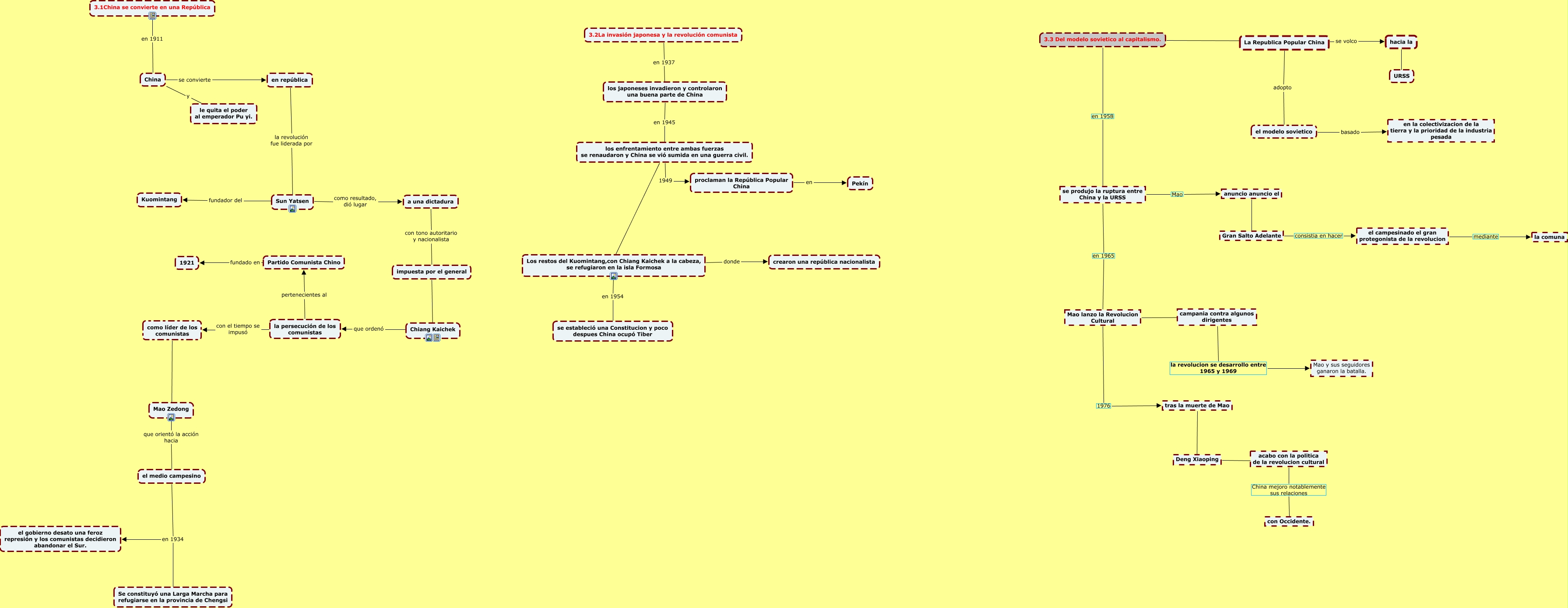 Cette carte conceptuelle, cree avec IHMC CmapTools, contient des informations liees a : tema 12 punto 3, campania contra algunos dirigentes la revolucion se desarrollo entre 1965 y 1969 Mao y sus seguidores ganaron la batalla., Chiang Kaichek que ordenó la persecución de los comunistas, anuncio anuncio el ???? Gran Salto Adelante, 3.3 Del modelo sovietico al capitalismo. ???? La Republica Popular China, Sun Yatsen como resultado, dió lugar a una dictadura, impuesta por el general ???? Chiang Kaichek, Los restos del Kuomintang,con Chiang Kaichek a la cabeza, se refugiaron en la isla Formosa en 1954 se estableció una Constitucion y poco despues China ocupó Tiber, Partido Comunista Chino fundado en 1921, 3.2La invasión japonesa y la revolución comunista en 1937 los japoneses invadieron y controlaron una buena parte de China, como líder de los comunistas ???? Mao Zedong, proclaman la República Popular China en Pekín, el medio campesino en 1934 Se constituyó una Larga Marcha para refugiarse en la provincia de Chengsi, la persecución de los comunistas con el tiempo se impusó como líder de los comunistas, se produjo la ruptura entre China y la URSS Mao anuncio anuncio el, tras la muerte de Mao ???? Deng Xiaoping, Mao Zedong que orientó la acción hacia el medio campesino, los japoneses invadieron y controlaron una buena parte de China en 1945 los enfrentamiento entre ambas fuerzas se renaudaron y China se vió sumida en una guerra civil., los enfrentamiento entre ambas fuerzas se renaudaron y China se vió sumida en una guerra civil. 1949 proclaman la República Popular China, Mao lanzo la Revolucion Cultural 1976 tras la muerte de Mao, se produjo la ruptura entre China y la URSS en 1965 Mao lanzo la Revolucion Cultural