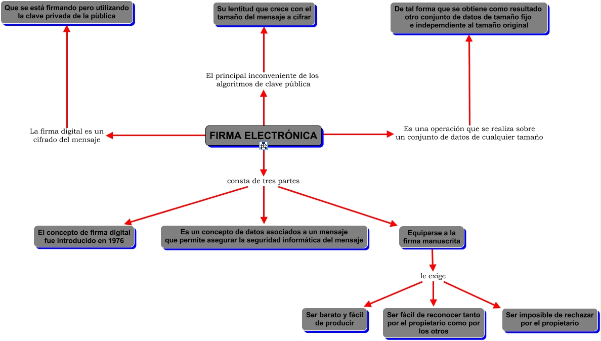 Este Cmap, tiene información relacionada con: Firma Electrónica, FIRMA ELECTRÓNICA Es una operación que se realiza sobre un conjunto de datos de cualquier tamaño De tal forma que se obtiene como resultado otro conjunto de datos de tamaño fijo e indepemdiente al tamaño original, Equiparse a la firma manuscrita le exige Ser imposible de rechazar por el propietario, Equiparse a la firma manuscrita le exige Ser barato y fácil de producir, FIRMA ELECTRÓNICA consta de tres partes El concepto de firma digital fue introducido en 1976, FIRMA ELECTRÓNICA El principal inconveniente de los algoritmos de clave pública Su lentitud que crece con el tamaño del mensaje a cifrar, FIRMA ELECTRÓNICA La firma digital es un cifrado del mensaje Que se está firmando pero utilizando la clave privada de la pública, Equiparse a la firma manuscrita le exige Ser fácil de reconocer tanto por el propietario como por los otros, FIRMA ELECTRÓNICA consta de tres partes Es un concepto de datos asociados a un mensaje que permite asegurar la seguridad informática del mensaje, FIRMA ELECTRÓNICA consta de tres partes Equiparse a la firma manuscrita