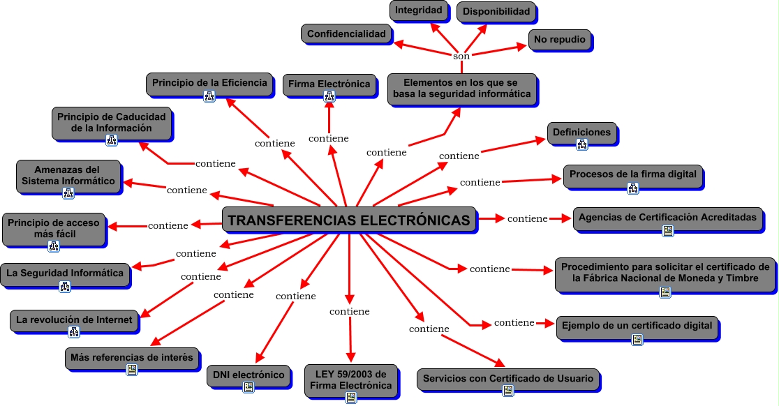 Este Cmap, tiene información relacionada con: Transferencias Electrónicas, TRANSFERENCIAS ELECTRÓNICAS contiene Elementos en los que se basa la seguridad informática, TRANSFERENCIAS ELECTRÓNICAS contiene La revolución de Internet, TRANSFERENCIAS ELECTRÓNICAS contiene La Seguridad Informática, TRANSFERENCIAS ELECTRÓNICAS contiene DNI electrónico, TRANSFERENCIAS ELECTRÓNICAS contiene Principio de la Eficiencia, Elementos en los que se basa la seguridad informática son No repudio, TRANSFERENCIAS ELECTRÓNICAS contiene LEY 59/2003 de Firma Electrónica, TRANSFERENCIAS ELECTRÓNICAS contiene Procesos de la firma digital, TRANSFERENCIAS ELECTRÓNICAS contiene Principio de Caducidad de la Información, Elementos en los que se basa la seguridad informática son Confidencialidad, Elementos en los que se basa la seguridad informática son Integridad, TRANSFERENCIAS ELECTRÓNICAS contiene Ejemplo de un certificado digital, TRANSFERENCIAS ELECTRÓNICAS contiene Más referencias de interés, Elementos en los que se basa la seguridad informática son Disponibilidad, TRANSFERENCIAS ELECTRÓNICAS contiene Amenazas del Sistema Informático, TRANSFERENCIAS ELECTRÓNICAS contiene Servicios con Certificado de Usuario, TRANSFERENCIAS ELECTRÓNICAS contiene Agencias de Certificación Acreditadas, TRANSFERENCIAS ELECTRÓNICAS contiene Definiciones, TRANSFERENCIAS ELECTRÓNICAS contiene Principio de acceso más fácil, TRANSFERENCIAS ELECTRÓNICAS contiene Firma Electrónica