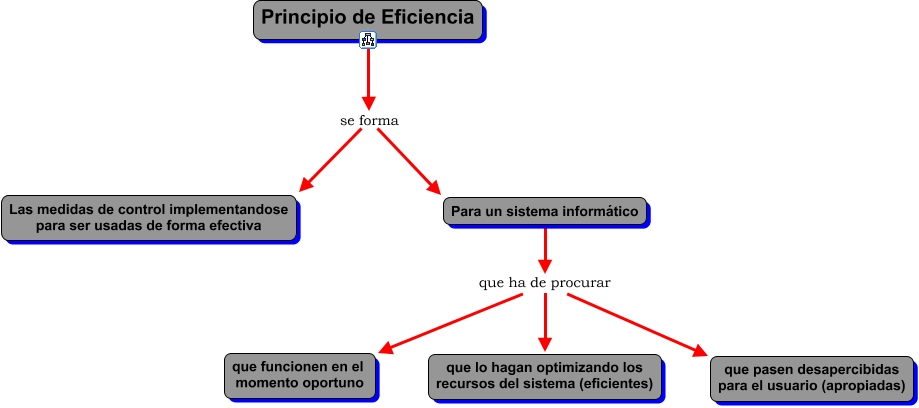 Este Cmap, tiene información relacionada con: Principio de eficiencia, Para un sistema informático que ha de procurar que lo hagan optimizando los recursos del sistema (eficientes), Principio de Eficiencia se forma Para un sistema informático, Para un sistema informático que ha de procurar que pasen desapercibidas para el usuario (apropiadas), Principio de Eficiencia se forma Las medidas de control implementandose para ser usadas de forma efectiva, Para un sistema informático que ha de procurar que funcionen en el momento oportuno