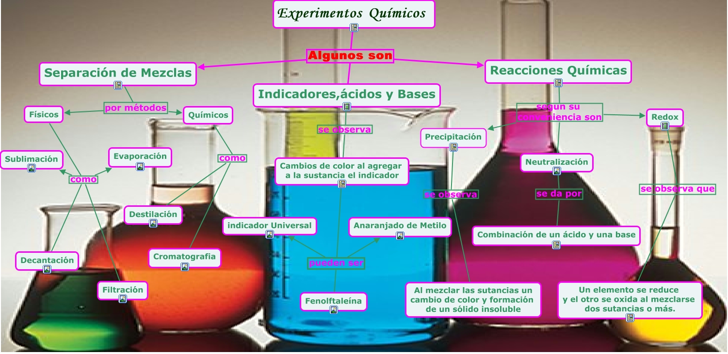 Este mapa conceptual tiene información relacionada a: Experimentos Químicos, Físicos como Evaporación, Experimentos Químicos Algunos son Indicadores,ácidos y Bases, Cambios de color al agregar a la sustancia el indicador pueden ser indicador Universal, Experimentos Químicos Algunos son Reacciones Químicas, Reacciones Químicas segun su conveniencia son Neutralización, Cambios de color al agregar a la sustancia el indicador pueden ser Fenolftaleína, Cambios de color al agregar a la sustancia el indicador pueden ser Anaranjado de Metilo, Neutralización se da por Combinación de un ácido y una base, Experimentos Químicos Algunos son Separación de Mezclas, Precipitación se observa Al mezclar las sutancias un cambio de color y formación de un sólido insoluble, Físicos como Sublimación, Químicos como Cromatografia, Separación de Mezclas por métodos Químicos, Físicos como Filtración, Indicadores,ácidos y Bases se observa Cambios de color al agregar a la sustancia el indicador, Redox se observa que Un elemento se reduce y el otro se oxida al mezclarse dos sutancias o más., Reacciones Químicas segun su conveniencia son Redox, Físicos como Decantación, Separación de Mezclas por métodos Físicos, Químicos como Destilación
